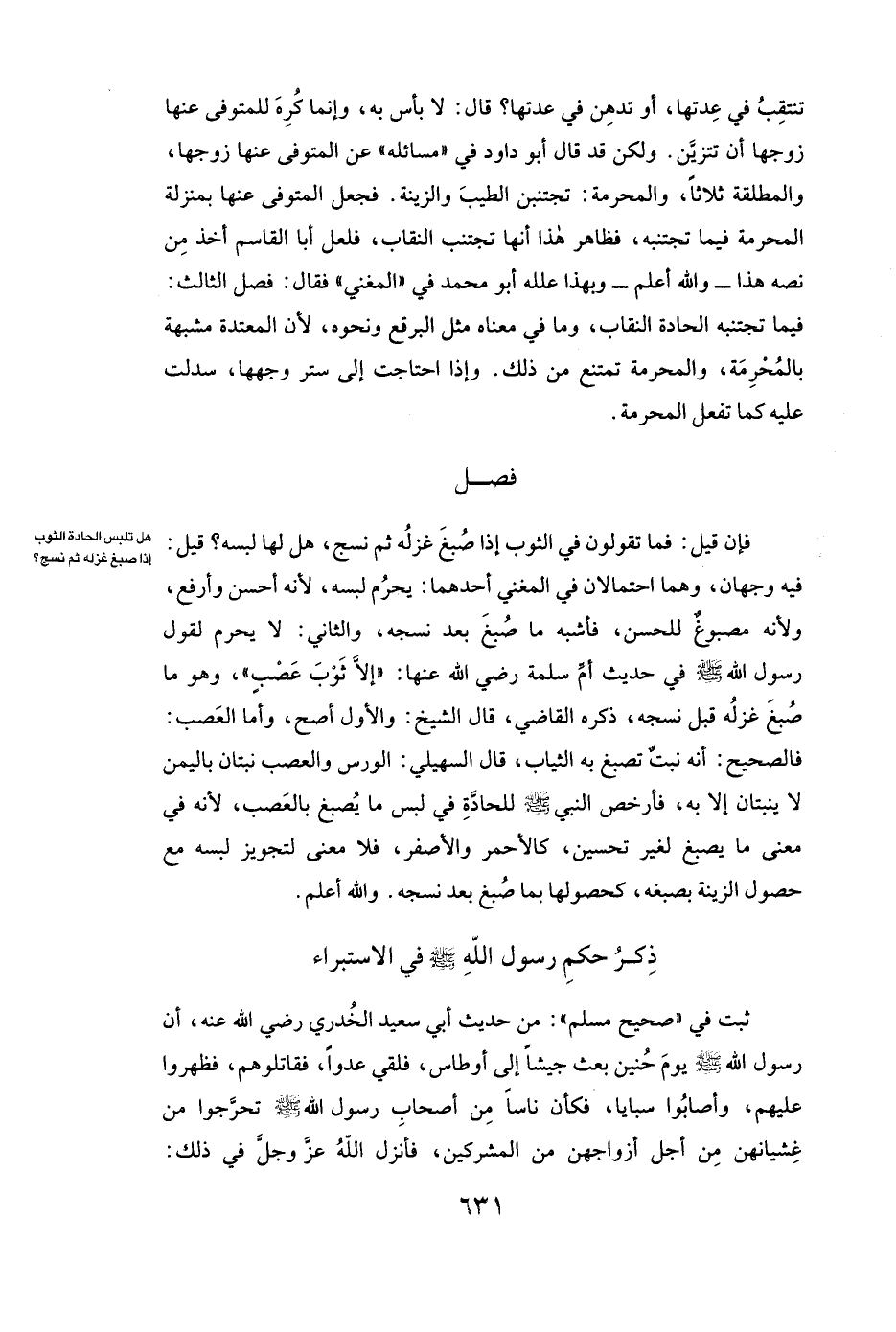 فَإِنْ قِيلَ: فَمَا تَقُولُونَ فِي الثَّوْبِ إِذَا صُبِغَ غَزْلُهُ، ثُمَّ نُسِجَ هَلْ لَهَا لَبْسُهُ؟ قِيلَ: فِيهِ وَجْهَانِ وَهُمَا احْتِمَالَانِ فِي الْمُغْنِي أَحَدُهُمَا: يَحْرُمُ لَبْسُهُ؛ لِأَنَّهُ أَحْسَنُ وَأَرْفَعُ، وَلِأَنَّهُ مَصْبُوغٌ لِلْحُسْنِ فَأَشْبَهُ مَا صُبِغَ بَعْدَ نَسْجِهِ، وَالثَّانِي: لَا يَحْرُمُ لِقَوْلِ رَسُولِ اللَّهِ صَلَّى اللَّهُ عَلَيْهِ وَسَلَّمَ فِي حَدِيثِ أم سلمة رَضِيَ اللَّهُ عَنْهَا: ( «إِلَّا ثَوْبَ عَصْبٍ» ) ، وَهُوَ مَا صُبِغَ غَزْلُهُ قَبْلَ نَسْجِهِ ذَكَرَهُ الْقَاضِي