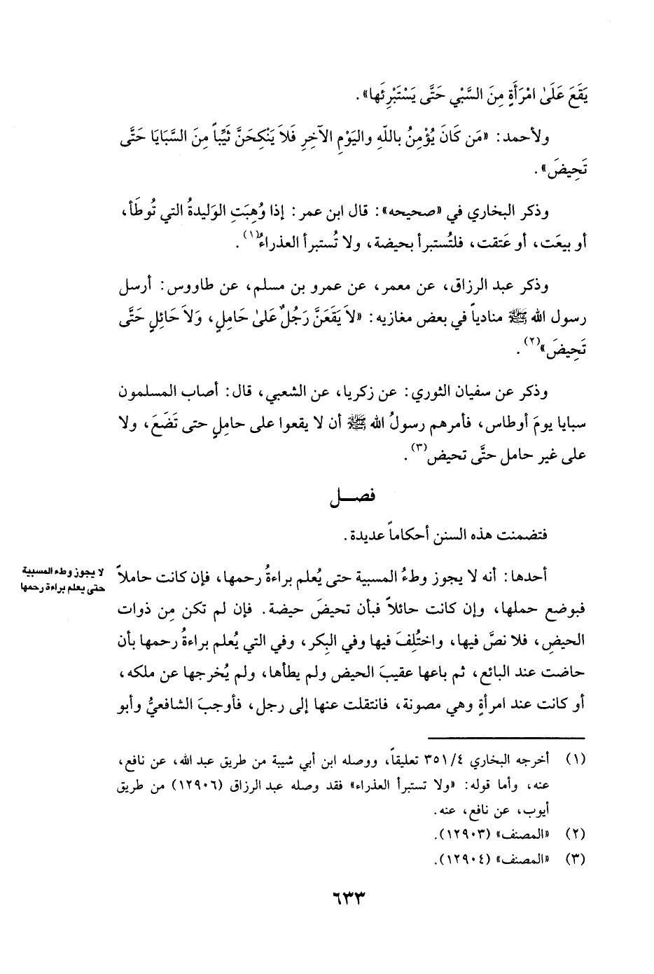ولأحمد: ( «مَنْ كَانَ يُؤْمِنُ بِاللَّهِ وَالْيَوْمِ الْآخِرِ فَلَا يَنْكِحَنَّ ثَيِّبًا مِنَ السَّبَايَا حَتَّى تَحِيضَ» ) . وَذَكَرَ الْبُخَارِيُّ فِي " صَحِيحِهِ ": قَالَ ابْنُ عُمَرَ: ( «إِذَا وُهِبَتِ الْوَلِيدَةُ الَّتِي تُوطَأُ، أَوْ بِيعَتْ، أَوْ عَتَقَتْ فَلْتُسْتَبْرَأْ بِحَيْضَةٍ، وَلَا تُسْتَبْرَأُ الْعَذْرَاءُ» ) .