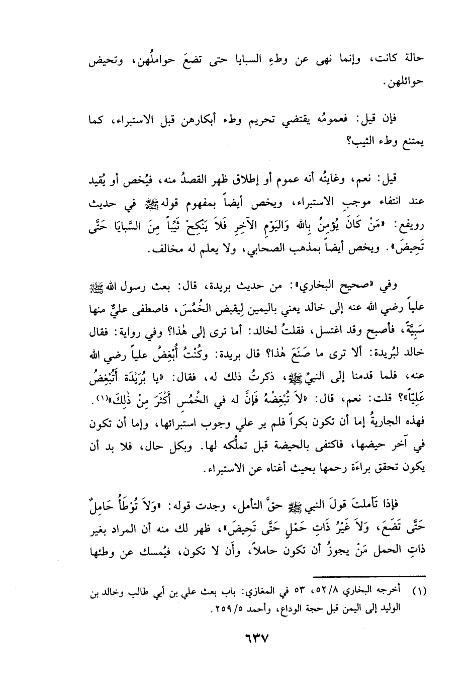 فَإِذَا تَأَمَّلْتَ قَوْلَ النَّبِيِّ - صَلَّى اللَّهُ عَلَيْهِ وَسَلَّمَ - حَقَّ التَّأَمُّلِ، وَجَدْتَ قَوْلَهُ: ( «وَلَا تُوطَأُ حَامِلٌ حَتَّى تَضَعَ، وَلَا غَيْرُ ذَاتِ حَمْلٍ حَتَى تَحِيضَ» ) ، ظَهَرَ لَكَ مِنْهُ أَنَّ الْمُرَادَ بِغَيْرِ ذَاتِ الْحَمْلِ مَنْ يَجُوزُ أَنْ تَكُونَ حَامِلًا، وَأَنْ لَا تَكُونَ، فَيُمْسِكُ عَنْ وَطْئِهَا