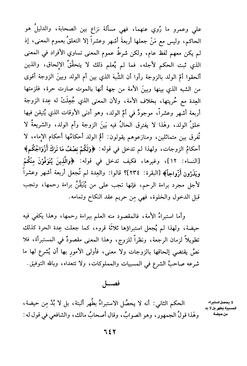 علي وعمرو مَا رُوِيَ عَنْهُمَا، فَهِيَ مَسْأَلَةُ نِزَاعٍ بَيْنَ الصَّحَابَةِ، وَالدَّلِيلُ هُوَ الْحَاكِمُ، وَلَيْسَ مَعَ مَنْ جَعَلَهَا أَرْبَعَةَ أَشْهُرٍ وَعَشْرًا إِلَّا التَّعَلُّقُ بِعُمُومِ الْمَعْنَى، إِذْ لَمْ يَكُنْ مَعَهُمْ لَفْظٌ عَامٌّ، وَلَكِنَّ شَرْطَ عُمُومِ الْمَعْنَى تَسَاوِي الْأَفْرَادِ فِي الْمَعْنَى الَّذِي ثَبَتَ الْحُكْمُ لِأَجْلِهِ، فَمَا لَمْ يُعْلَمْ ذَلِكَ لَا يَتَحَقَّقُ الْإِلْحَاقُ، وَالَّذِينَ أَلْحَقُوا أُمَّ الْوَلَدِ بِالزَّوْجَةِ رَأَوْا أَنَّ الشَّبَهَ الَّذِي بَيْنَ أُمِّ الْوَلَدِ وَبَيْنَ الزَّوْجَةِ أَقْوَى مِنَ الشَّبَهِ الَّذِي بَيْنَهَا وَبَيْنَ الْأَمَةِ مِنْ جِهَةِ أَنَّهَا بِالْمَوْتِ صَارَتْ حُرَّةً، فَلَزِمَتْهَا الْعِدَّةُ مَعَ حُرِّيَّتِهَا، بِخِلَافِ الْأَمَةِ؛ وَلِأَنَّ الْمَعْنَى الَّذِي جُعِلَتْ لَهُ عِدَّةُ الزَّوْجَةِ أَرْبَعَةَ أَشْهُرٍ وَعَشْرًا، مَوْجُودٌ فِي أُمِّ الْوَلَدِ، وَهُوَ أَدْنَى الْأَوْقَاتِ الَّذِي يُتَيَقَّنُ فِيهَا خَلْقُ الْوَلَدِ، وَهَذَا لَا يَفْتَرِقُ الْحَالُ فِيهِ بَيْنَ الزَّوْجَةِ وَأُمِّ الْوَلَدِ، وَالشَّرِيعَةُ لَا تُفَرِّقُ بَيْنَ مُتَمَاثِلَيْنِ، وَمُنَازِعُوهُمْ يَقُولُونَ: أُمُّ الْوَلَدِ أَحْكَامُهَا أَحْكَامُ الْإِمَاءِ، لَا أَحْكَامُ الزَّوْجَاتِ، وَلِهَذَا لَمْ تَدْخُلْ فِي قَوْلِهِ: {وَلَكُمْ نِصْفُ مَا تَرَكَ أَزْوَاجُكُمْ} [النساء: 12] [النِّسَاءِ: 12] ، وَغَيْرِهَا. فَكَيْفَ تَدْخُلُ فِي قَوْلِهِ: {وَالَّذِينَ يُتَوَفَّوْنَ مِنْكُمْ وَيَذَرُونَ أَزْوَاجًا} [البقرة: 234] [الْبَقَرَةِ: 234] ؟ قَالُوا: وَالْعِدَّةُ لَمْ تُجْعَلْ أَرْبَعَةَ أَشْهُرٍ وَعَشْرًا لِأَجْلِ مُجَرَّدِ بَرَاءَةِ الرَّحِمِ، فَإِنَّهَا تَجِبُ عَلَى مَنْ يُتَيَقَّنُ بَرَاءَةُ رَحِمِهَا وَتَجِبُ قَبْلَ الدُّخُولِ وَالْخَلْوَةِ فَهِيَ مِنْ حَرِيمِ عَقْدِ النِّكَاحِ وَتَمَامِهِ.