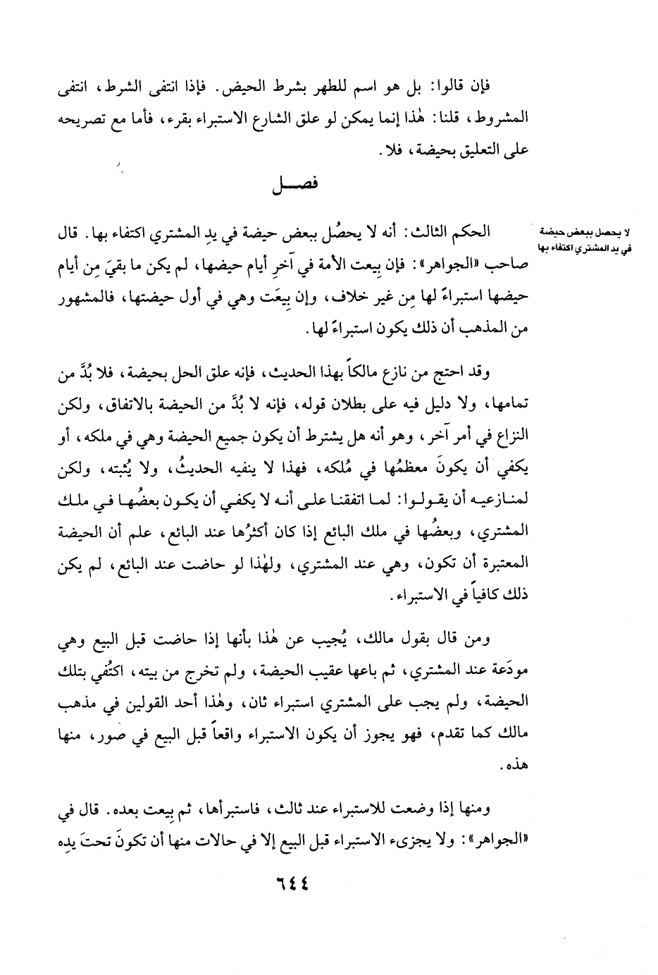 وَقَدِ احْتَجَّ مَنْ نَازَعَ مَالِكًا بِهَذَا الْحَدِيثِ، فَإِنَّهُ عَلَّقَ الْحِلَّ بِحَيْضَةٍ فَلَا بُدَّ مِنْ تَمَامِهَا، وَلَا دَلِيلَ فِيهِ عَلَى بُطْلَانِ قَوْلِهِ، فَإِنَّهُ لَا بُدَّ مِنَ الْحَيْضَةِ بِالِاتِّفَاقِ، وَلَكِنَّ النِّزَاعَ فِي أَمْرٍ آخَرَ، وَهُوَ أَنَّهُ هَلْ يُشْتَرَطُ أَنْ يَكُونَ جَمِيعُ الْحَيْضَةِ وَهِيَ فِي مِلْكِهِ، أَوْ يَكْفِي أَنْ يَكُونَ مُعْظَمُهَا فِي مِلْكِهِ، فَهَذَا لَا يَنْفِيهِ الْحَدِيثُ، وَلَا يُثْبِتُهُ، وَلَكِنْ لِمُنَازِعِيهِ أَنْ يَقُولُوا: لَمَّا اتَّفَقْنَا عَلَى أَنَّهُ لَا يَكْفِي أَنْ يَكُونَ بَعْضُهَا فِي مِلْكِ الْمُشْتَرِي، وَبَعْضُهَا فِي مِلْكِ الْبَائِعِ إِذَا كَانَ أَكْثَرُهَا عِنْدَ الْبَائِعِ، عُلِمَ أَنَّ الْحَيْضَةَ الْمُعْتَبَرَةَ أَنْ تَكُونَ وَهِيَ عِنْدَ الْمُشْتَرِي، وَلِهَذَا لَوْ حَاضَتْ عِنْدَ الْبَائِعِ، لَمْ يَكُنْ ذَلِكَ كَافِيًا فِي الِاسْتِبْرَاءِ.