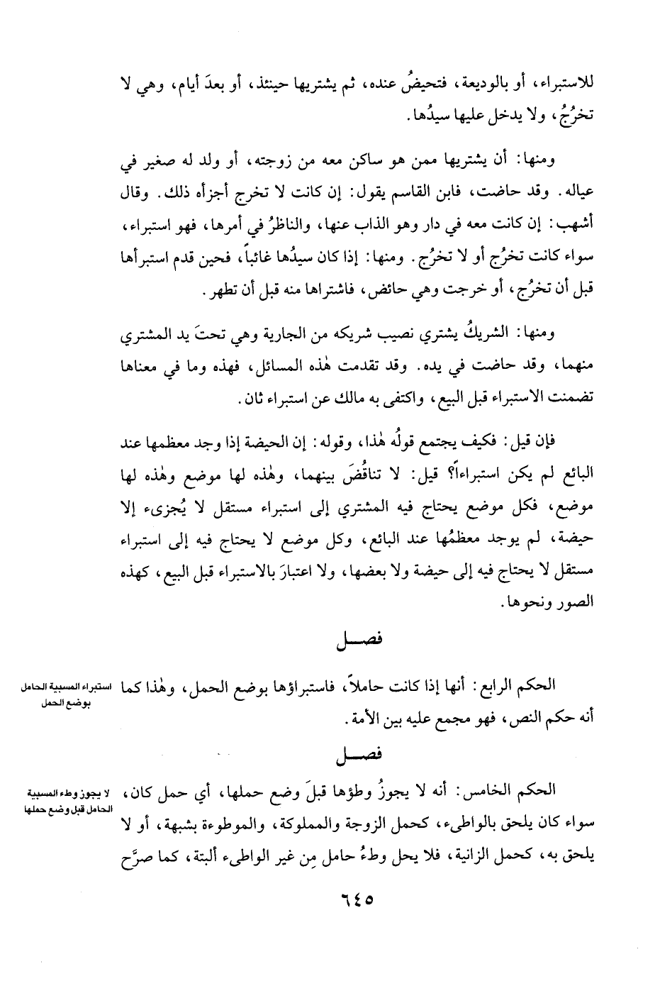 الْحُكْمُ الْخَامِسُ: أَنَّهُ لَا يَجُوزُ وَطْؤُهَا قَبْلَ وَضْعِ حَمْلِهَا، أَيِّ حَمْلٍ كَانَ، سَوَاءٌ كَانَ يَلْحَقُ بِالْوَاطِئِ، كَحَمْلِ الزَّوْجَةِ وَالْمَمْلُوكَةِ، وَالْمَوْطُوءَةِ بِشُبْهَةِ، أَوْ لَا يَلْحَقُ بِهِ، كَحَمْلِ الزَّانِيَةِ، فَلَا يَحِلُّ وَطْءُ حَامِلٍ مِنْ غَيْرِ الْوَاطِئِ الْبَتَّةَ، كَمَا صَرَّحَ