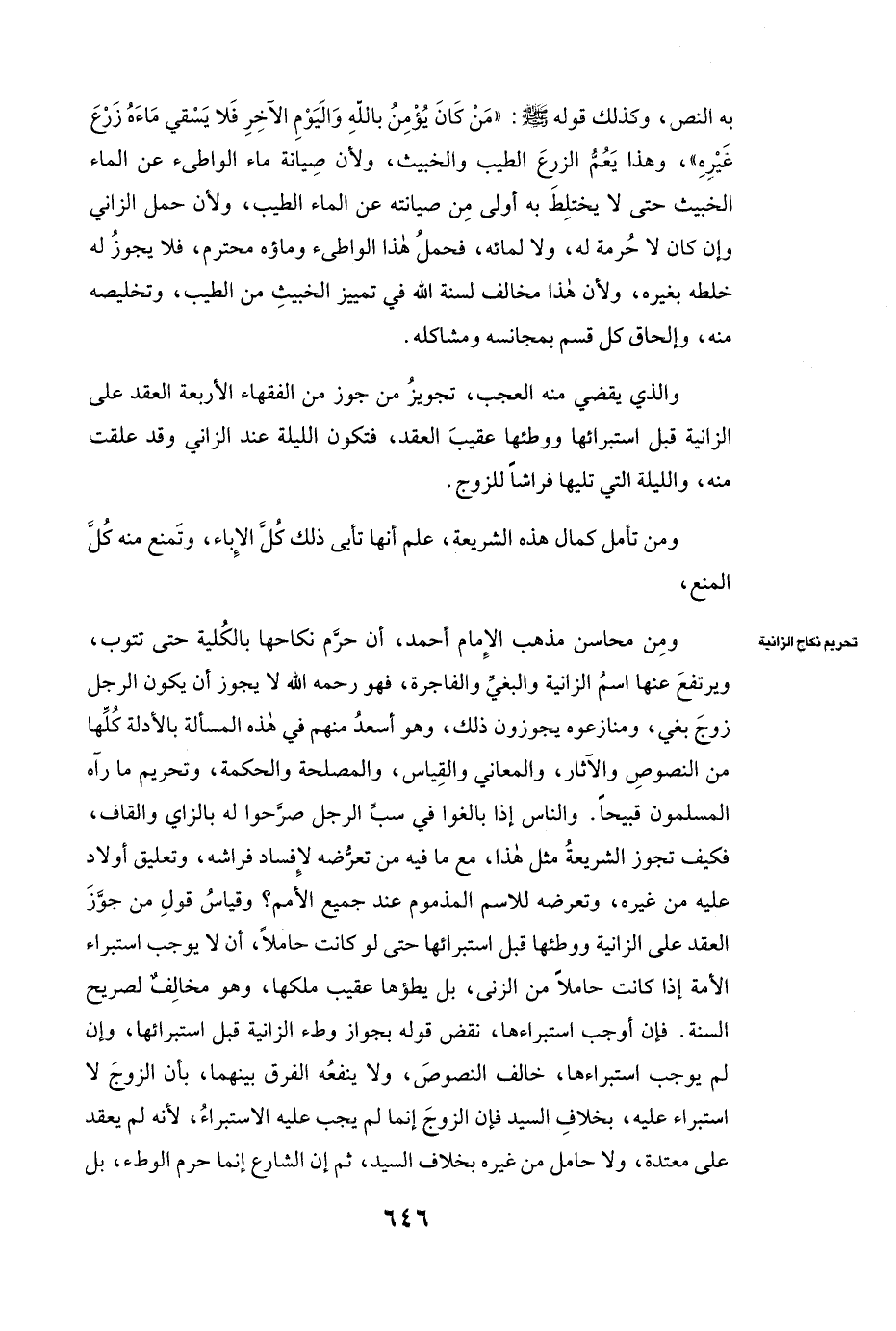 وَالَّذِي يَقْضِي مِنْهُ الْعَجَبَ تَجْوِيزُ مَنْ جَوَّزَ مِنَ الْفُقَهَاءِ الْأَرْبَعَةِ الْعَقْدَ عَلَى الزَّانِيَةِ قَبْلَ اسْتِبْرَائِهَا وَوَطْئَهَا عَقِيبَ الْعُقَدِ، فَتَكُونُ اللَّيْلَةَ عِنْدَ الزَّانِي وَقَدْ عَلِقَتْ مِنْهُ، وَاللَّيْلَةَ الَّتِي تَلِيهَا فِرَاشًا لِلزَّوْجِ.