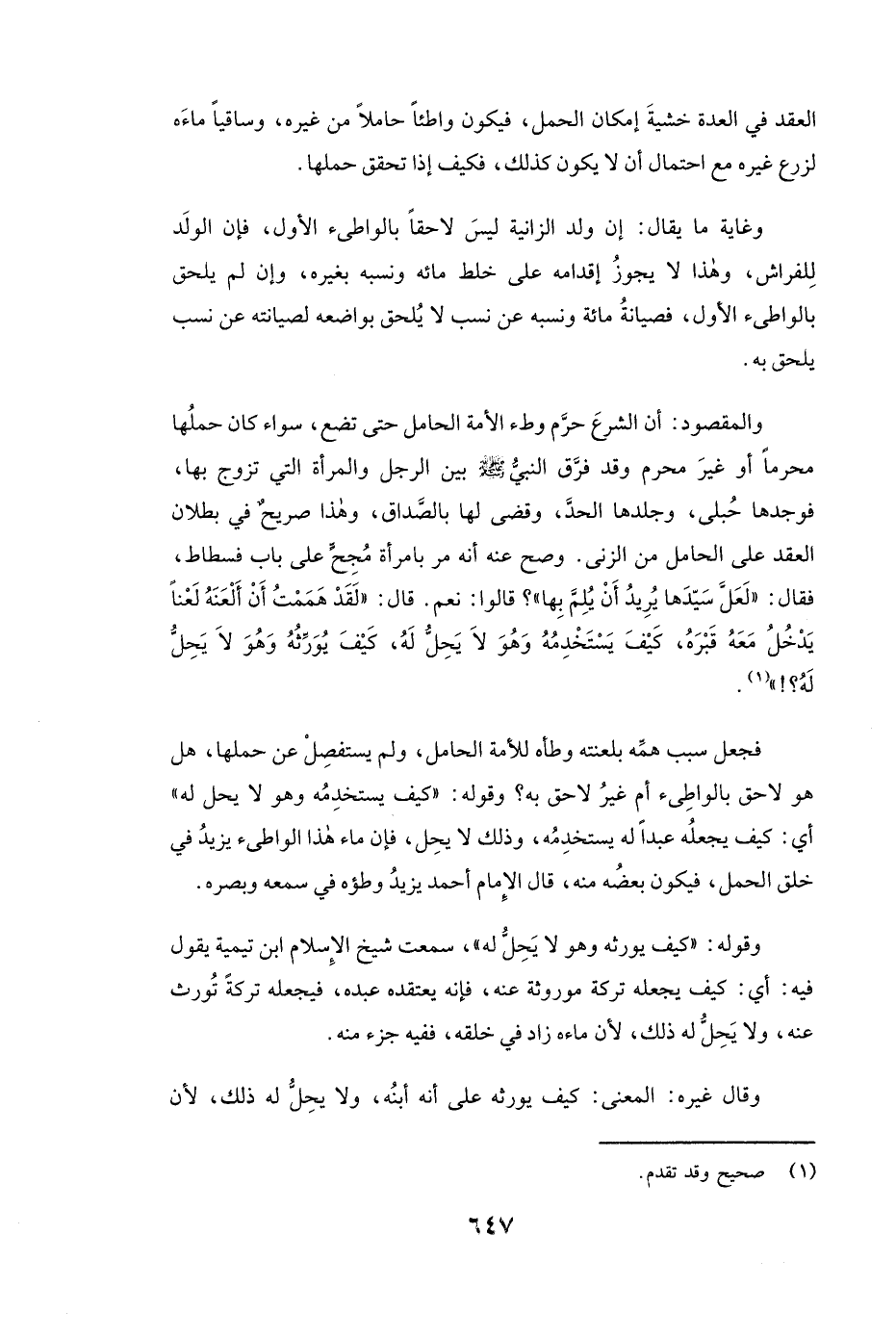 وَالْمَقْصُودُ: أَنَّ الشَّرْعَ حَرَّمَ وَطْءَ الْأَمَةِ الْحَامِلِ حَتَّى تَضَعَ، سَوَاءٌ كَانَ حَمْلُهَا مُحَرَّمًا أَوْ غَيْرَ مُحَرَّمٍ وَقَدْ فَرَّقَ النَّبِيُّ - صَلَّى اللَّهُ عَلَيْهِ وَسَلَّمَ - بَيْنَ الرَّجُلِ وَالْمَرْأَةِ الَّتِي تَزَوَّجَ بِهَا، فَوَجَدَهَا حُبْلَى، وَجَلَدَهَا الْحَدَّ، وَقَضَى لَهَا بِالصَّدَاقِ، وَهَذَا صَرِيحٌ فِي بُطْلَانِ الْعَقْدِ عَلَى الْحَامِلِ مِنَ الزِّنَى. (وَصَحَّ عَنْهُ «أَنَّهُ مَرَّ بِامْرَأَةِ مُجِحٍّ عَلَى بَابٍ فُسْطَاطٍ فَقَالَ: (لَعَلَّ سَيِّدَهَا يُرِيدُ أَنْ يُلِمَّ بِهَا) ؟ قَالُوا: نَعَمْ. قَالَ: (لَقَدْ هَمَمْتُ أَنْ أَلْعَنَهُ لَعْنًا يَدْخُلُ مَعَهُ قَبْرَهُ، كَيْفَ يَسْتَخْدِمُهُ وَهُوَ لَا يَحِلُّ لَهُ، كَيْفَ يُوَرِّثُهُ وَهُوَ لَا يَحِلُّ لَهُ» ؟) .
