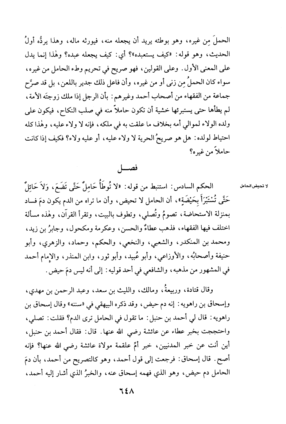 الْحُكْمُ السَّادِسُ: اسْتُنْبِطَ مِنْ قَوْلِهِ: ( «لَا تُوطَأُ حَامِلٌ حَتَى تَضَعَ، وَلَا حَائِلٌ حَتَّى تُسْتَبْرَأَ بِحَيْضَةٍ» ) ، أَنَّ الْحَامِلَ لَا تَحِيضُ، وَأَنَّ مَا تَرَاهُ مِنَ الدَّمِ يَكُونُ دَمَ فَسَادٍ بِمَنْزِلَةِ الِاسْتِحَاضَةِ، تَصُومُ وَتُصَلِّي، وَتَطُوفُ بِالْبَيْتِ، وَتَقْرَأُ الْقُرْآنَ، وَهَذِهِ مَسْأَلَةٌ اخْتَلَفَ فِيهَا الْفُقَهَاءُ، فَذَهَبَ عطاء والحسن، وعكرمة ومكحول، وَجَابِرُ بْنُ زَيْدٍ، وَمُحَمَّدُ بْنُ الْمُنْكَدِرِ، وَالشَّعْبِيُّ، والنخعي، والحكم، وحماد، وَالزُّهْرِيُّ، وأبو حنيفة وَأَصْحَابُهُ، وَالْأَوْزَاعِيُّ، وأبو عبيد، وَأَبُو ثَوْرٍ، وابن المنذر، وَالْإِمَامُ أَحْمَدُ فِي الْمَشْهُورِ مِنْ مَذْهَبِهِ، وَالشَّافِعِيُّ، فِي أَحَدِ قَوْلَيْهِ إِلَى أَنَّهُ لَيْسَ دَمَ حَيْضٍ.