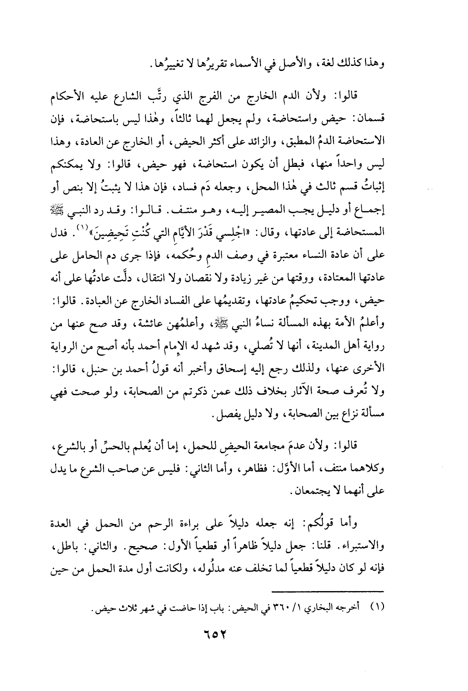 فَدَلَّ عَلَى أَنَّ عَادَةَ النِّسَاءِ مُعْتَبَرَةٌ فِي وَصْفِ الدَّمِ وَحُكْمِهِ، فَإِذَا جَرَى دَمُ الْحَامِلِ عَلَى عَادَتِهَا الْمُعْتَادَةِ، وَوَقْتِهَا مِنْ غَيْرِ زِيَادَةٍ وَلَا نُقْصَانٍ وَلَا انْتِقَالٍ، دَلَّتْ عَادَتُهَا عَلَى أَنَّهُ حَيْضٌ، وَوَجَبَ تَحْكِيمُ عَادَتِهَا، وَتَقْدِيمُهَا عَلَى الْفَسَادِ الْخَارِجِ عَنِ الْعِبَادَةِ.