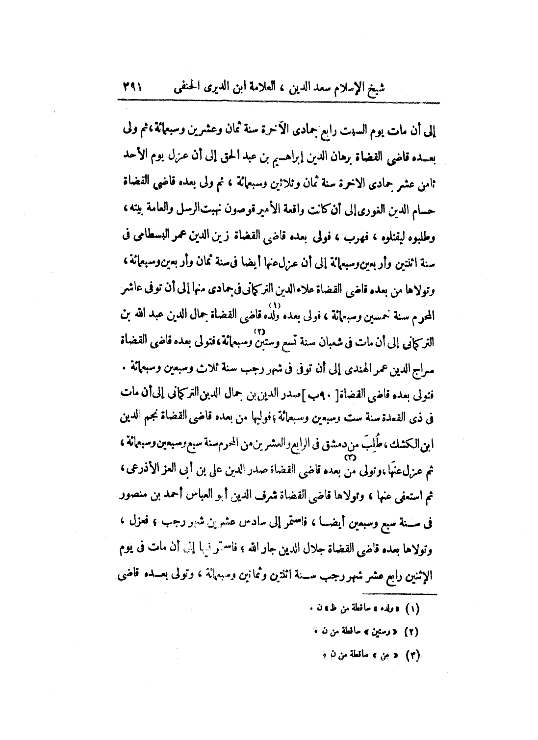 إلى أن مات يوم السبت رابع جمادى الآخرة سنة ثمان وعشرين وسبعمائة، ثم ولي بعده قاضي القضاة برهان الدين إبراهيم بن عبد الحق إلى أن عزل يوم الأحد ثامن عشر جمادى الآخرة سنة ثمان وثلاثين وسبعمائة، ثم ولي بعده قاضي القضاة حسام الدين الغوري إلى أن كانت واقعة الأمير قوصون نهبت الرسل والعامة بيته، وطلبوه ليقتلوه، فهرب، فولي بعده قاضي القضاة زين الدين عمر البسطامي في سنة اثنتين وأربعين وسبعمائة إلى أن عزل عنها أيضاً في سنة ثمان وأربعين وسبعمائة، وتولاها من بعده قاضي القضاة علاء الدين التركماني في جمادى منها إلى أن توفي عاشر المحرم سنة خمسين وسبعمائة، فولي بعده ولده قاضي القضاة جمال الدين عبد الله بن التركماني إلى أن مات في شعبان سنة تسع وستين وسبعمائة، فتولى بعده قاضي القضاة سراج الدين عمر الهندي إلى أن توفي في شهر رجب سنة ثلاث وسبعين وسبعمائة. فتولى بعده قاضي القضاة صدر الدين بن جمال الدين التركماني إلى أن مات في ذي القعدة سنة ست وسبعين وسبعمائة؛ فوليها من بعده قاضي القضاة نجم الدين ابن الكشك، طُلِبَ من دمشق في الرابع والعشرين من المحرم سنة سبع وسبعين وسبعمائة، ثم عزل عنها، وتولى من بعده قاضي القضاة صدر الدين علي بن أبي العز الأذرعي، ثم استعفى عنها، وتولاها قاضي القضاة شرف الدين أبو العباس أحمد بن منصور في سنة سبع وسبعين أيضاً، فاستمر إلى سادس عشرين شهر رجب؛ فعزل، وتولاها بعده قاضي القضاة جلال الدين جار الله؛ فاستمر فيها إلى أن مات في يوم الاثنين رابع عشر شهر رجب سنة اثنتين وثمانين وسبعمائة، وتولى بعده قاضي