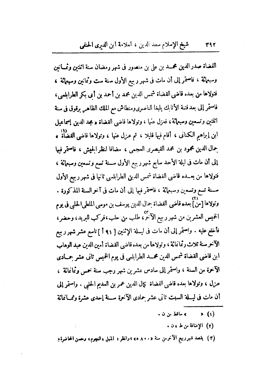 القضاة صدر الدين محمد بن علي بن منصور في شهر رمضان سنة اثنتين وثمانين وسبعمائة، فاستمر إلى أن مات في شهر ربيع الأول سنة ست وثمانين وسبعمائة، فتولاها من بعده قاضي القضاة شمس الدين محمد بن أحمد بن أبي بكر الطرابلسي، فاستمر إلى بعد فتنة الأتابك يلبغا الناصري ومنطاش مع الملك الظاهر برقوق في سنة اثنتين وتسعين وسبعمائة، فعزل عنها، وتولاها قاضي القضاة مجد الدين إسماعيل ابن إبراهيم الكناني، أقام فيها قليلاً، ثم عزل عنها، وتولاها قاضي القضاة جمال الدين محمود بن محمد القيصري العجمي، مضافاً لنظر الجيش، فاستمر فيها إلى أن مات في ليلة الأحد سابع شهر ربيع الأول سنة تسع وتسعين وسبعمائة، فتولاها من بعده قاضي القضاة شمس الدين الطرابلسي ثانياً في شهر ربيع الأول سنة تسع وتسعين وسبعمائة، فاستمر فيها إلى أن مات في آخر السنة المذكورة. وتولاها من بعده قاضي القضاة جمال الدين يوسف بن موسى الملطي الحلبي في يوم الخميس العشرين من شهر ربيع الآخر، طلب من حلب، فركب البريد، وحضر، فأخلع عليه. واستمر إلى أن مات في ليلة الاثنين تاسع عشر شهر ربيع الآخر سنة ثلاث وثمانمائة، وتولاها من بعده قاضي القضاة أمين الدين عبد الوهاب ابن قاضي القضاة شمس الدين محمد الطرابلسي في يوم الخميس ثاني عشر جمادى الآخرة من السنة، واستمر إلى سادس عشرين شهر رجب سنة خمس وثمانمائة، عزل، وتولاها بعده قاضي القضاة كمال الدين عمر بن العديم الحلبي. واستمر إلى أن مات في ليلة السبت ثاني عشر جمادى الآخرة سنة إحدى عشرة وثمانمائة