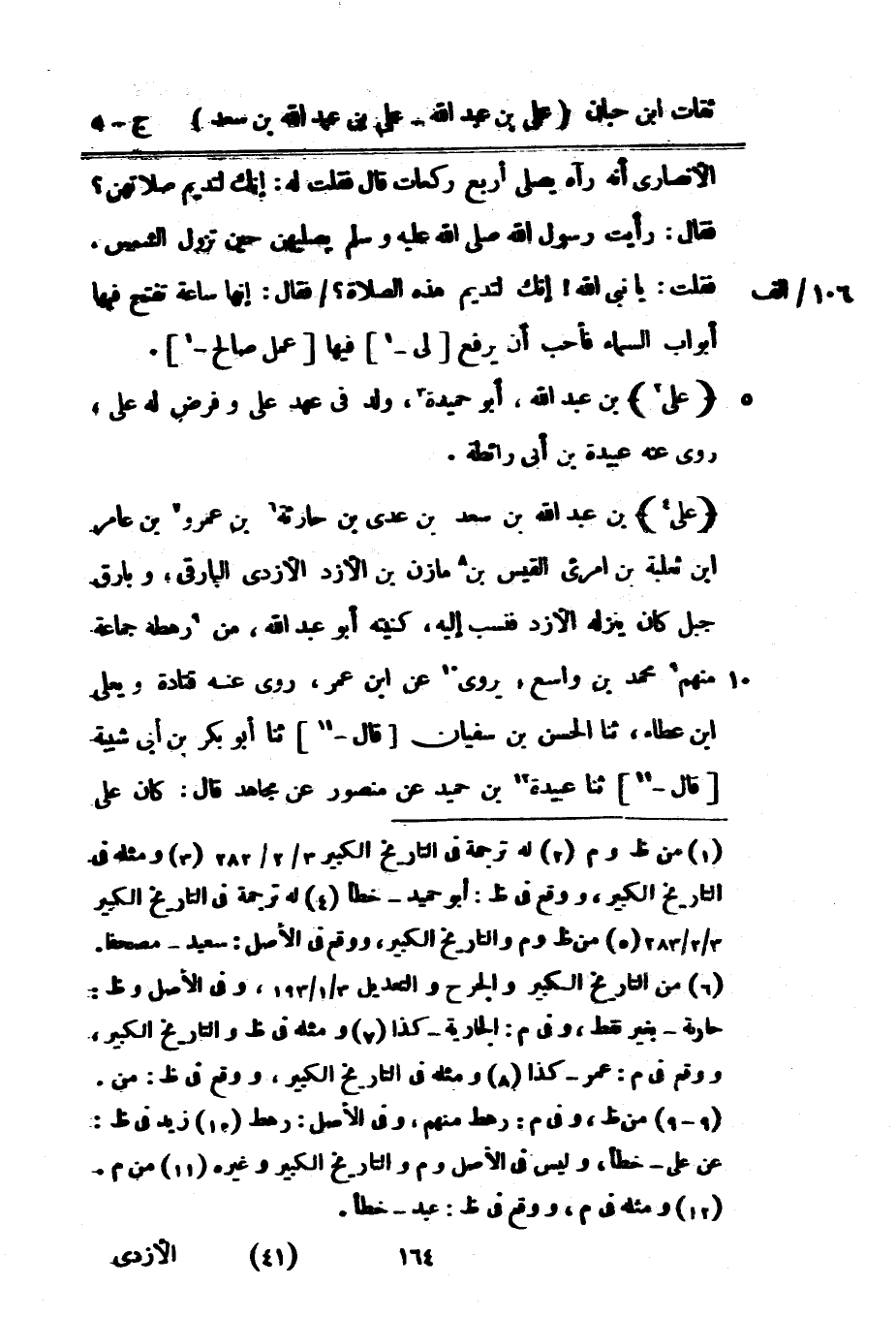 4386 - عَليّ بْن عَبْد اللَّه بْن سعد بْن عدى بْن حَارِثَة بْن عَمْرو بْن عَامر بْن ثَعْلَبَة بْن امْرِئ الْقَيْس بْن مَازِن بْن الأزد الْبَارِقي وبارق جبل كَانَ ينزله الأزد فنسب إِلَيْهِ كُنْيَتُهُ أَبُو عَبْد اللَّه من رهطه جمَاعَة مِنْهُم مُحَمَّد بن وَاسع يروي عَن بْن عمر روى عَنْهُ قَتَادَة ويعلى بْن عَطاء ثَنَا الْحسن بْن سُفْيَان قَالَ ثَنَا أَبُو بَكْرِ بْنُ أَبِي شَيْبَة قَالَ ثَنَا عُبَيْدَة بْن حميد عَن مَنْصُور عَن مُجَاهِد قَالَ كَانَ عَليّ