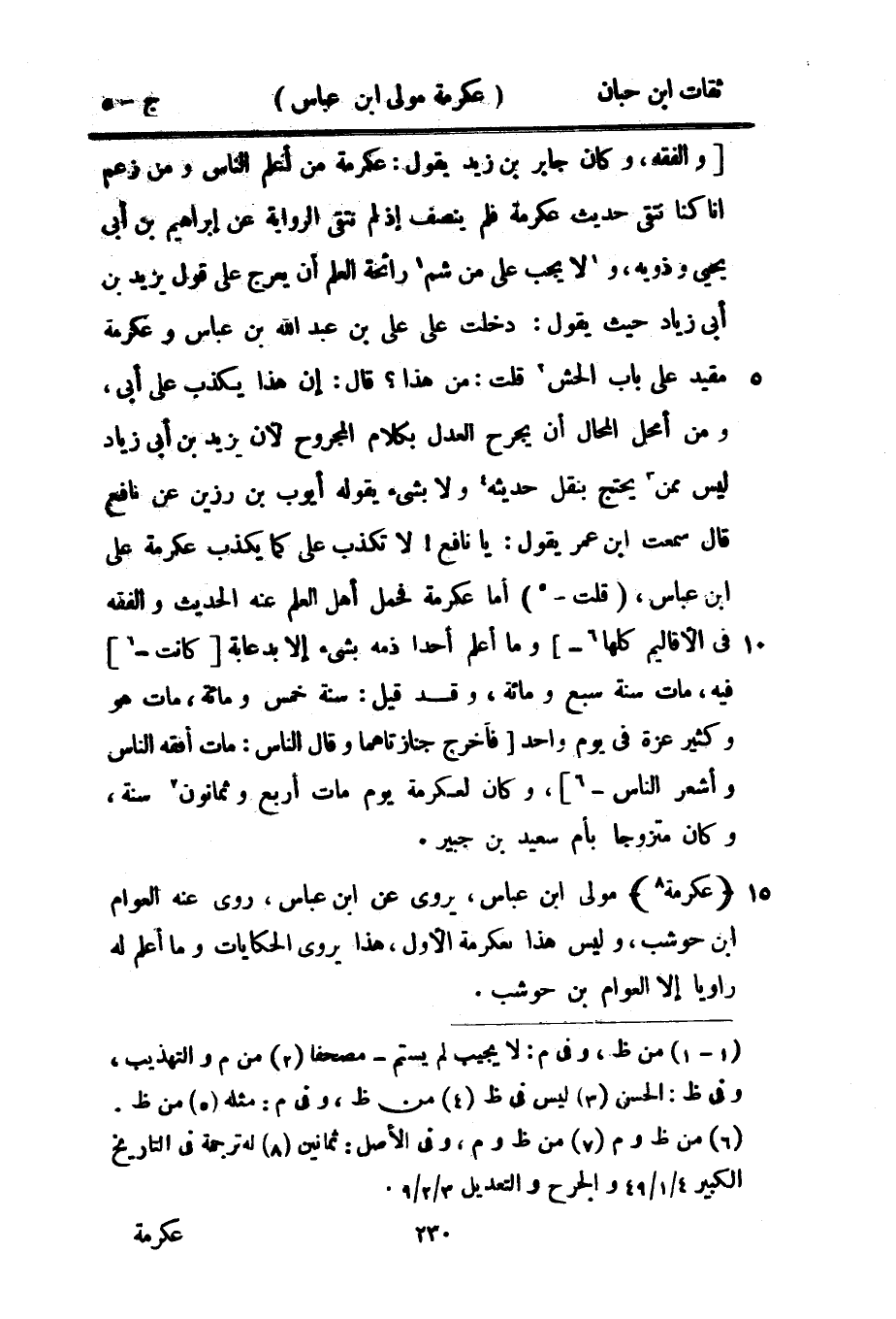 وَالْفِقْه وَكَانَ جَابر بْن زيد يَقُول عِكْرِمَة من أعلم النَّاس وَمن زعم إِنَّا كُنَّا نتقي حَدِيث عِكْرِمَة فَلم ينصف إِذْ لم نتقي الرِّوَايَة عَن إِبْرَاهِيم بْن أبي يحيى وَذَوِيهِ وَلَا يجب على من شم رَائِحَة الْعلم أَن يعرج على قَول يزِيد بْن أبي زِيَاد حَيْثُ يَقُول دخلت على عَليّ بْن عَبْد اللَّه بْن عَبَّاس وَعِكْرِمَة مُقَيّد على بَاب الحش قلت من هَذَا قَالَ إِن هَذَا يكذب على أَبِي وَمن أمحل الْمحَال أَن يجرح الْعدْل بِكَلَام الْمَجْرُوح لِأَن يزِيد بْن أَبِي زِيَاد لَيْسَ مِمَّن يحْتَج بِنَقْل حَدِيثه وَلَا بِشَيْء يَقُوله أَيُّوب بْن رزين عَن نَافِع قَالَ سَمِعت بن عمر يَقُول يَا نَافِع لَا تكذب عَليّ كَمَا يكذب عِكْرِمَة على بن عَبَّاس قلت أما عِكْرِمَة فَحمل أهل الْعلم عَنْهُ الحَدِيث وَالْفِقْه فِي الأقاليم كلهَا وَمَا أعلم أحدا ذمه بِشَيْء إِلَّا بدعابة كَانَت فِيهِ مَاتَ سنة سبع وَمِائَة وَقد قيل سنة خمس وَمِائَة مَاتَ هُوَ وَكثير عزة فِي يَوْم وَاحِد فَأخْرج جنازتهما وَقَالَ النَّاس مَاتَ أفقه النَّاس وأشعر النَّاس وَكَانَ لعكرمة يَوْم مَاتَ أَربع وَثَمَانُونَ سنة وَكَانَ متزوجا بِأم سَعِيد بْن جُبَير