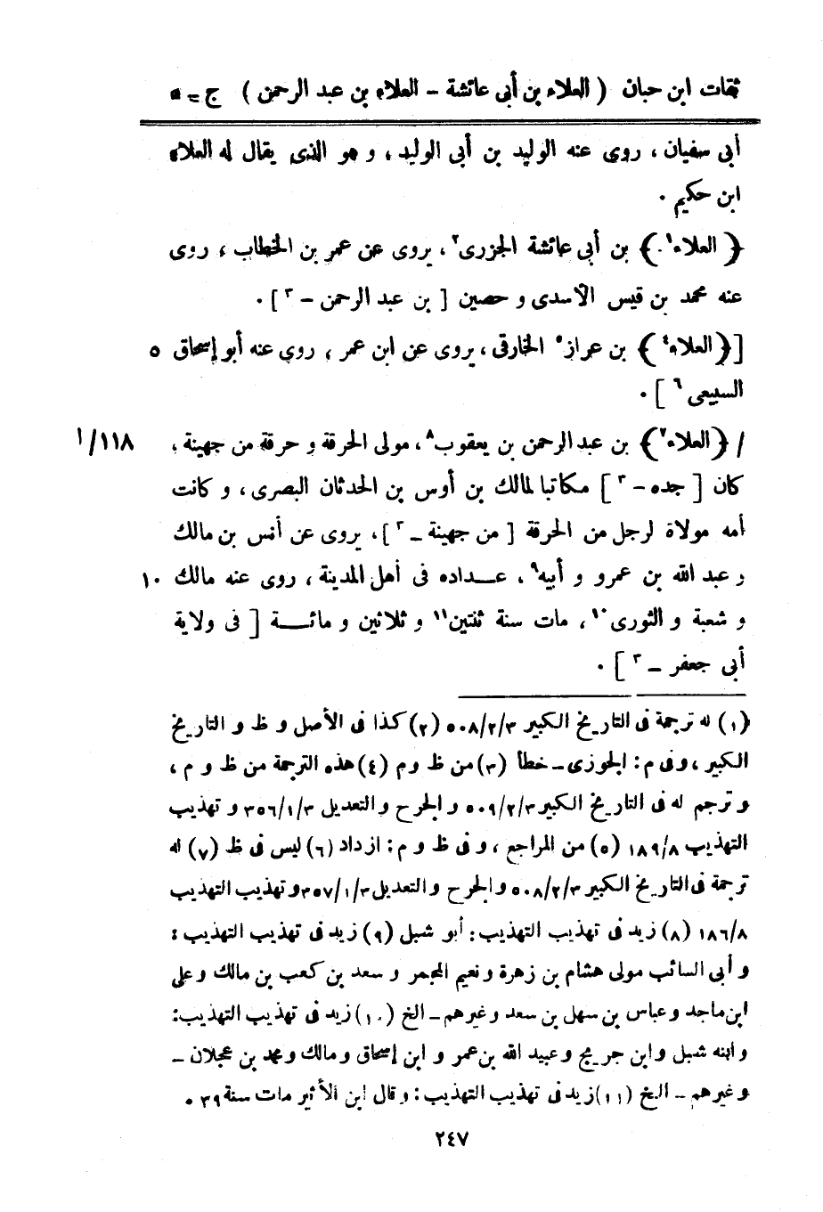 4689 - الْعَلَاء بْن عَبْد الرَّحْمَن بْن يَعْقُوب مولى الحرقة وحرقة من جُهَيْنَة كَانَ جده مكَاتبا لمَالِك بْن أَوْس بْن الْحدثَان الْبَصْرِيّ وَكَانَت أمه مولاة لرجل من الحرقة من الجهينة يَرْوِي عَن أنس بْن مَالك وعَبْد اللَّه بْن عَمْرو وَأَبِيهِ عداده فِي أهل الْمَدِينَة رَوَى عَنْهُ مَالك وشعبه وَالثَّوْري مَاتَ سنة ثِنْتَيْنِ وَثَلَاثِينَ وَمِائَة فِي ولَايَة أَبى جَعْفَر