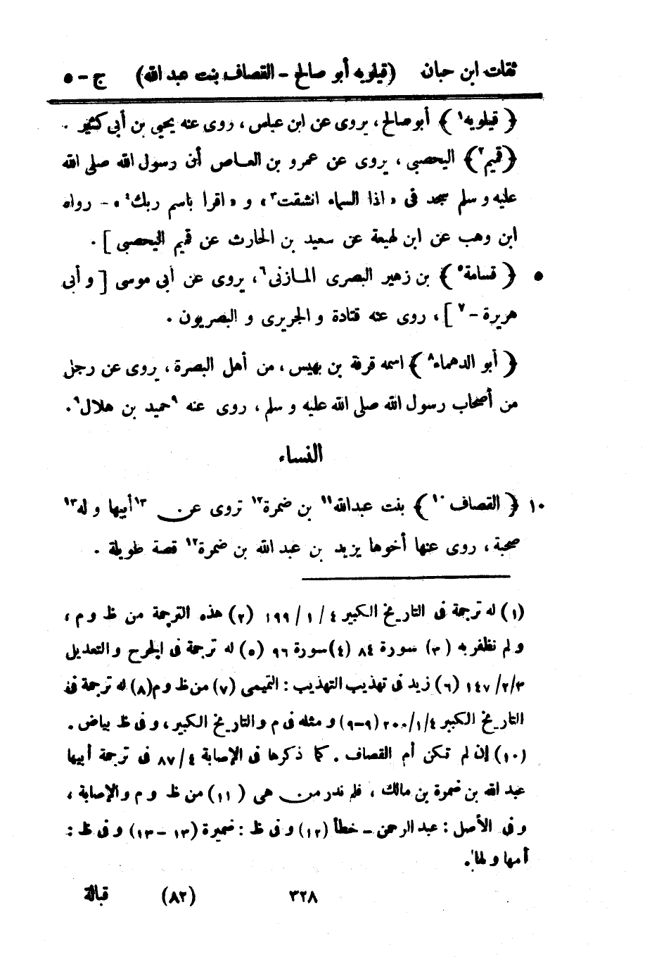 5069 - القصاف بنت عَبْد اللَّه بْن ضَمرَة تَرْوِي عَن أَبِيهَا وَله صُحْبَة رَوَى عَنْهَا أَخُوهَا يزِيد بْن عَبْد اللَّه بْن ضَمرَة قصَّة طَوِيلَة