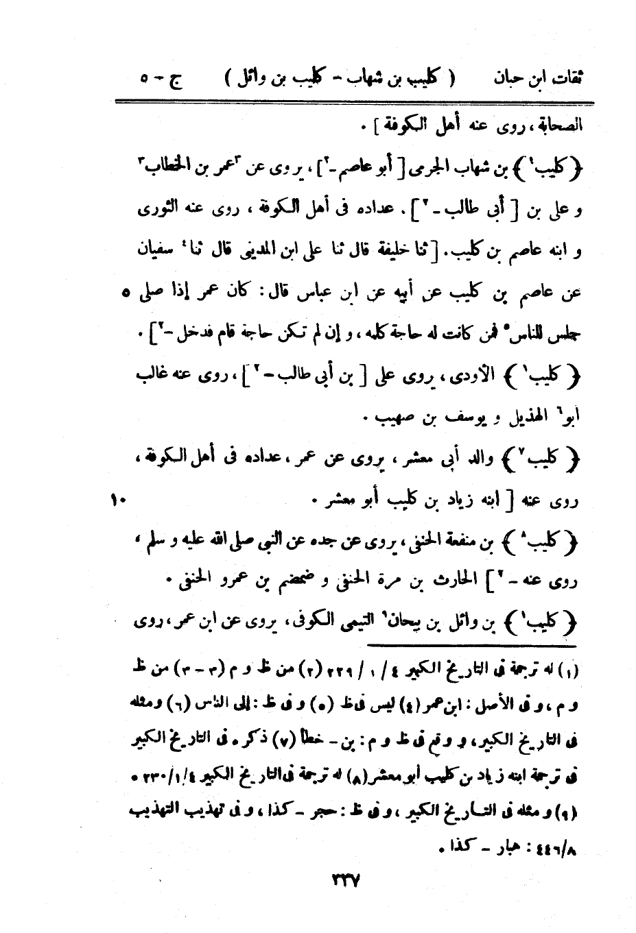 5111 - كُلَيْبُ بْنُ شِهَابٍ الْجَرْمِيُّ أَبُو عَاصِمٍ يَرْوِي عَنْ عُمَرَ بْنِ الْخطاب وعَلى بْن أَبِي طَالب عداده فِي أهل الْكُوفَة روى عَنهُ الثَّوْريّ وَابْنه عَاصِم بن كُلَيْب ثَنَا أَبُو خَلِيفَةَ قَالَ ثَنَا عَلِيُّ بْنُ الْمَدِينِيِّ قَالَ ثَنَا سُفْيَانُ عَنْ عَاصِمِ بْنِ كُلَيْب عَن أَبِيه عَن بن عَبَّاسٍ قَالَ كَانَ عُمَرُ إِذَا صَلَّى جَلَسَ لِلنَّاسِ فَمَنْ كَانَتْ لَهُ حَاجَةٌ كَلَّمَهُ وَإِنْ لَمْ تَكُنْ حَاجَةٌ قَامَ فَدَخَلَ