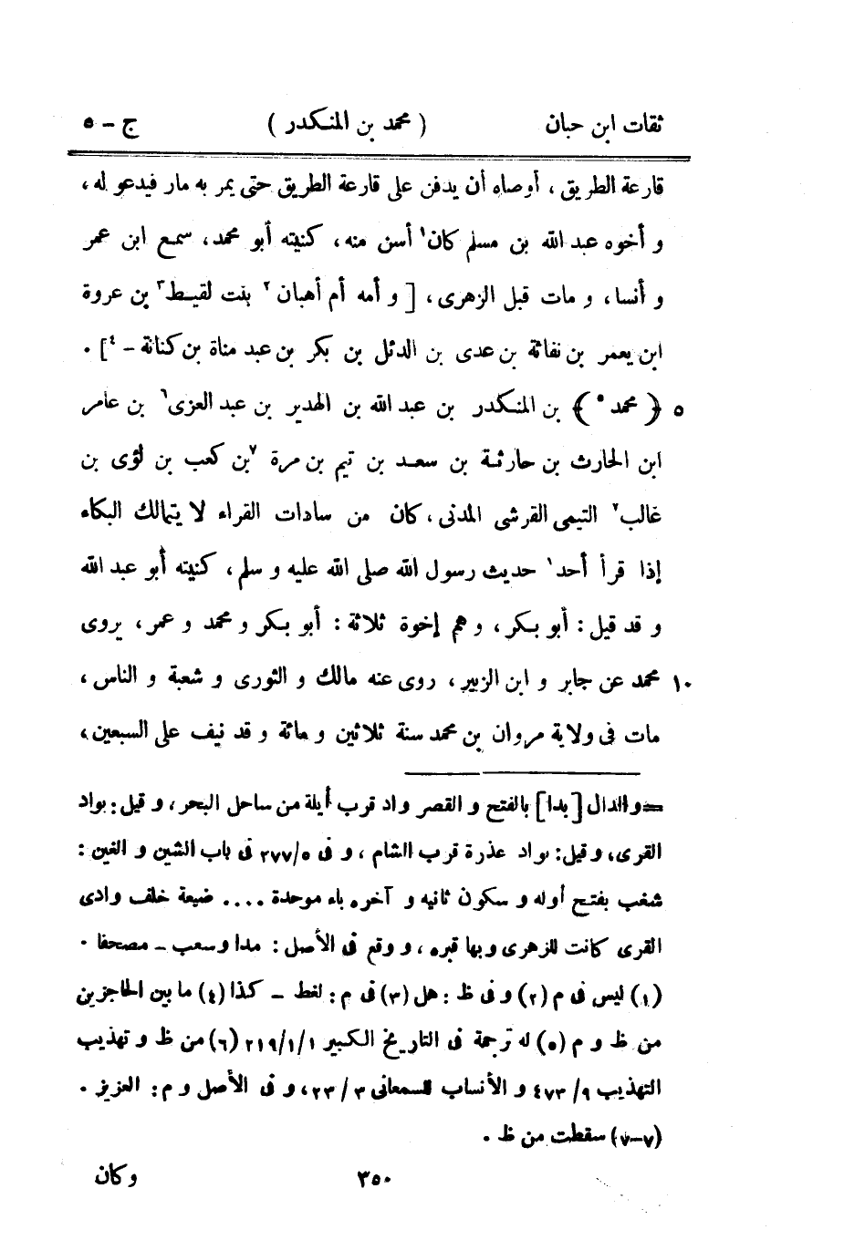 5163 - مُحَمَّد بن الْمُنْكَدر بْن عَبْد اللَّه بْن الهدير بْن عَبْد الْعُزَّى بْن عَامر بْن الْحَارِث بْن حَارِثَة بْن سعد بْن تيم بْن مرّة بْن كَعْب بْن لؤَي بْن غَالب التَّيْمِيّ الْقرشِي الْمدنِي كَانَ من سَادَات الْقُرَّاء لَا يَتَمَالَك الْبكاء إِذا قَرَأَ أحد حَدِيث رَسُولُ اللَّهِ صَلَّى اللَّهُ عَلَيْهِ وَسَلَّمَ كُنْيَتُهُ أَبُو عَبْدِ اللَّهِ وَقد قيل أَبُو بكر وهم إخْوَة ثَلَاثَة أَبُو بكر وَمُحَمّد وَعمر يروي مُحَمَّد عَن جَابر وَابْن الزبير روى عَنهُ مَالك وَالثَّوْري وَشعْبَة وَالنَّاس مَاتَ فِي ولَايَة مَرْوَان بن مُحَمَّد سنة ثَلَاثِينَ وَمِائَة وَقد نَيف على السّبْعين