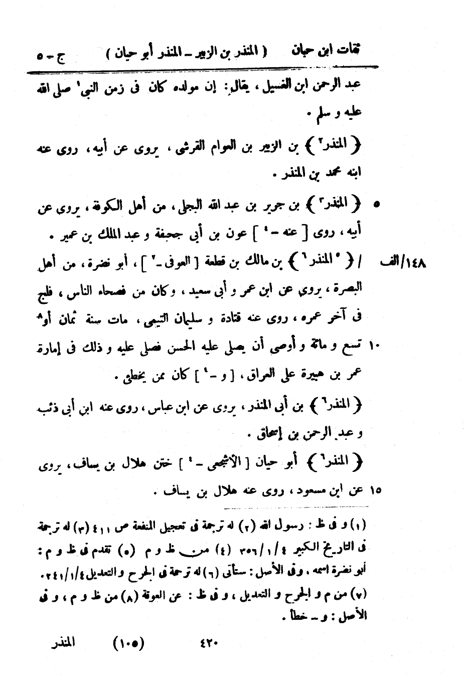 5499 - الْمُنْذر بن مَالك بن قِطْعَة الْعَوْفِيّ أَبُو نَضرة من أهل الْبَصْرَة يروي عَن بن عمر وَأبي سعيد وَكَانَ من فصحاء النَّاس فلج فِي آخر عمره روى عَنهُ قَتَادَة وَسليمَان التَّيْمِيّ مَاتَ سنة ثَمَان أَو تسع وَمِائَة وَأوصى أَن يُصَلِّي عَلَيْهِ الْحسن فصلى عَلَيْهِ وَذَلِكَ فِي إِمَارَة عمر بن هُبَيْرَة على الْعرَاق وَكَانَ مِمَّن يخطىء