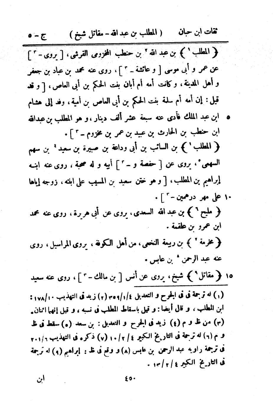 5667 - الْمطلب بْن عَبْد اللَّه بْن حنْطَب المَخْزُومِي الْقرشِي يروي عَن عمر وَأبي مُوسَى وَعَائِشَة روى عَنْهُ مُحَمَّد بْن عباد بْن جَعْفَر وَأهل الْمَدِينَة وَكَانَت أمه أم أبان بنت الحكم بن أبي الْعَاصِ وَقد قيل إِن أمه أم سَلمَة بنت الحكم بْن أبي الْعَاصِ بْن أُميَّة وَفد إِلَى هِشَام بن عبد الْملك فَأدى عَنهُ سَبْعَة عشر ألف دِينَار وَهُوَ الْمطلب بن عبد الله بن حنْطَب بن الْحَارِث بْن عبيد بْن عمر بن مَخْزُوم