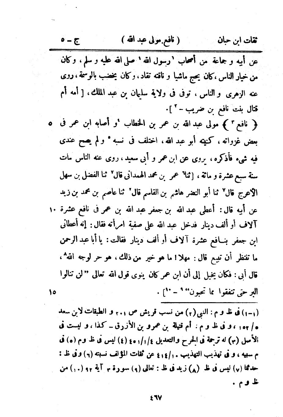 5757 - نَافِع مولى عبد الله بن عمر بن الْخطاب وأصابه بن عمر فِي بعض غَزَوَاته كنيته أَبُو عبد الله اخْتلف فِي نسبه وَلم يَصح عِنْدِي فِيهِ شَيْء فأذكره يرْوى عَن بن عُمَرَ وَأَبِي سَعِيدٍ رَوَى عَنْهُ النَّاس مَاتَ سنة سبع عشرَة وَمِائَة ثَنَا عُمَرُ بْنُ مُحَمَّدٍ الْهَمْدَانِيُّ قَالَ ثَنَا الْفَضْلُ بْنُ سَهْلٍ الأَعْرَجُ قَالَ ثَنَا أَبُو النَّضْرِ هَاشِمُ بْنُ الْقَاسِمِ قَالَ ثَنَا عَاصِمُ بْنُ مُحَمَّدِ بْنِ زَيْدٍ عَنْ أَبِيهِ قَالَ أَعْطَى عَبْدُ اللَّهِ بْنُ جَعْفَرٍ عَبْدَ اللَّهِ بْنَ عُمَرَ فِي نَافِعٍ عَشَرَةَ آلافٍ أَوْ أَلْفَ دِينَارٍ فَدَخَلَ عَبْدُ اللَّهِ عَلَى صَفِيَّةَ امْرَأَته فَقَالَ إِنَّه أعطانى بن جَعْفَرٍ بِنَافِعٍ عَشَرَةَ آلافٍ أَوْ أَلْفَ دِينَارٍ فَقَالَتْ يَا أَبَا عَبْدِ الرَّحْمَنِ مَا تَنْتَظِرُ أَنْ تَبِيعَ قَالَ مَهْلا مَا هُوَ خَيْرٌ مِنْ ذَلِكَ هُوَ حُرٌّ لِوَجْهِ اللَّهِ قَالَ أَبِي فَكَانَ يخيل إِلَى أَن بن عُمَرَ كَانَ يَنْوِي قَوْلَ اللَّهِ تَعَالَى لَنْ تَنَالُوا الْبِرَّ حَتَّى تنفقوا مِمَّا تحبون