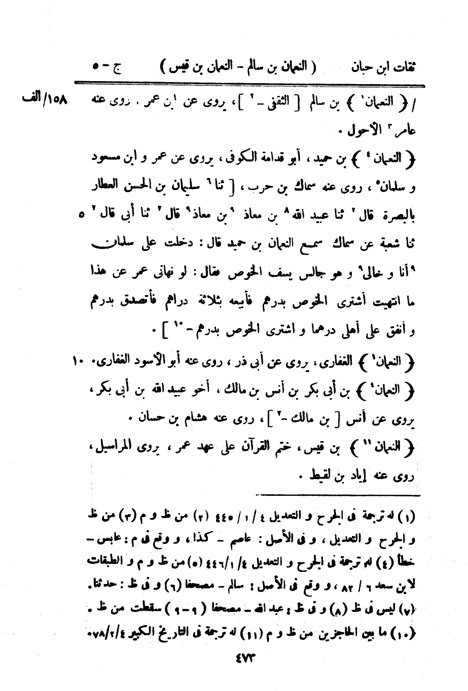 5783 - النُّعْمَان بن حميد أَبُو قدامَة الْكُوفِي يروي عَن عمر وَابْن مَسْعُود وسلمان روى عَنْهُ سِمَاكُ بْنُ حَرْبٍ ثَنَا سُلَيْمَان بن الْحسن الْعَطَّار بِالْبَصْرَةِ قَالَ ثَنَا عُبَيْدُ اللَّهِ بْنُ معَاذ بن معَاذ قَالَ ثَنَا أبي قَالَ ثَنَا شُعْبَة عَن سماك سمع النُّعْمَان بن حميد قَالَ دخلت على سلمَان أَنا وخالي وَهُوَ جَالس يسف الخوص فَقَالَ لَو نهاني عمر عَن هَذَا مَا انْتَهَيْت اشْترى الخوص بدرهم فأبيعه بِثَلَاث دَرَاهِم فأتصدق بدرهم وَأنْفق على أَهلِي درهما وَاشْترى الخوص بدرهم