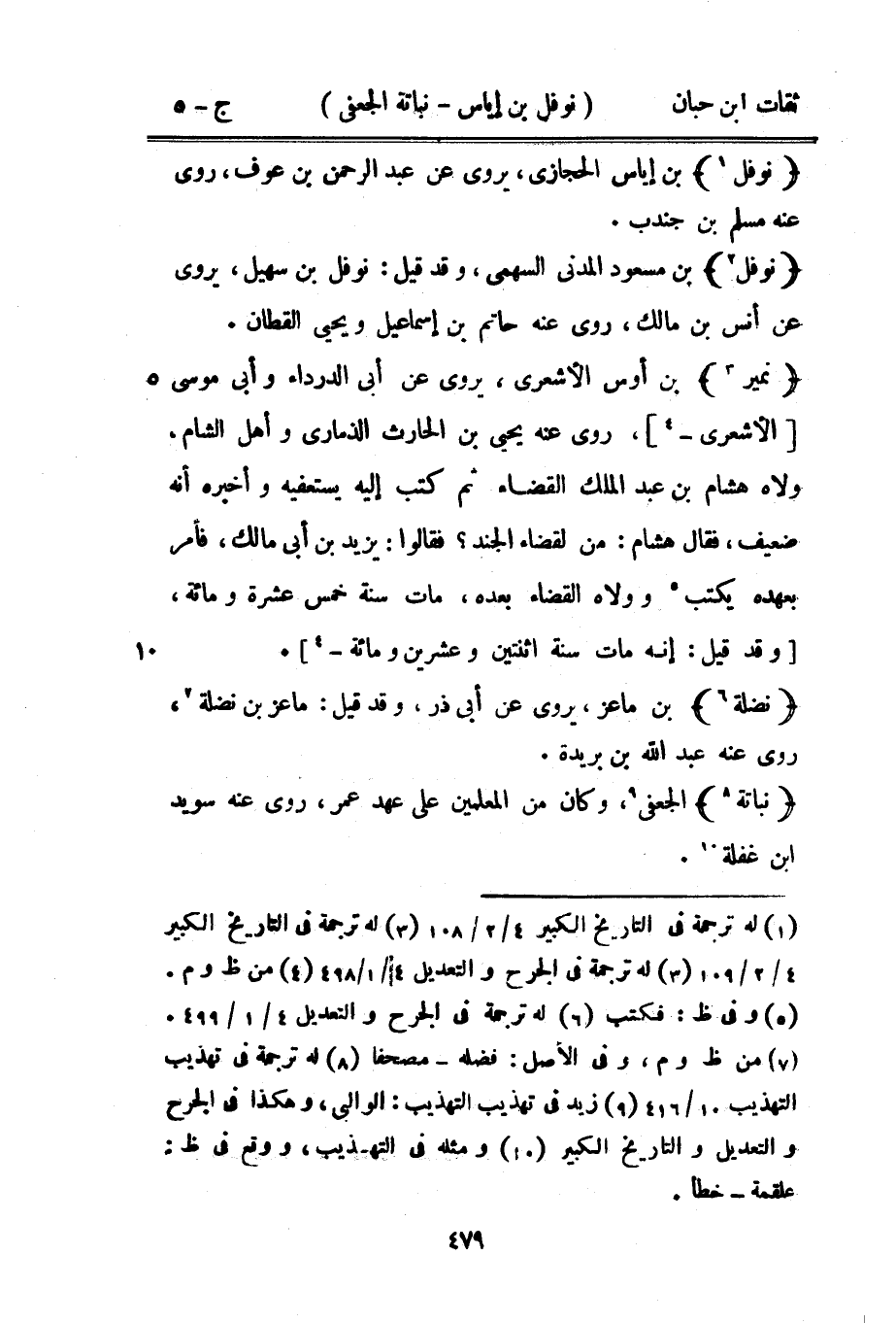 5817 - نمير بن أَوْس الْأَشْعَرِيّ يروي عَن أَبِي الدَّرْدَاء وَأبي مُوسَى الْأَشْعَرِيّ روى عَنهُ يحيى بن الْحَارِث الذمارِي وَأهل الشَّام ولاه هِشَام بن عبد الْملك الْقَضَاء ثمَّ كتب إِلَيْهِ يستعفيه وَأخْبرهُ أَنه ضَعِيف فَقَالَ هِشَام من لقَضَاء الْجند فَقَالَ يزِيد بن أبي مَالك فَأمر بعهده يكْتب وولاه الْقَضَاء بعده مَاتَ سنة خمس عشره ومائه وَقد قيل إِنَّه مَاتَ سنة اثْنَتَيْنِ وَعشْرين وَمِائَة