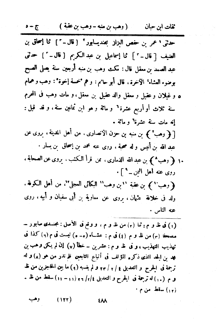 حَدثنِي عمر بن حَفْص الْبَزَّاز بجند يسابور قَالَ ثَنَا إِسْحَاق بن الضَّيْف قَالَ ثَنَا إِسْمَاعِيل بن عبد الْكَرِيم قَالَ حَدثنِي عبد الصَّمد بن معقل قَالَ مكث وهب بن مُنَبّه أَرْبَعِينَ سنة يُصَلِّي الصُّبْح بِوضُوء الْعشَاء قَالَ أَبُو حَاتِم وهم خَمْسَة إخْوَة وهب وَهَمَّام وغيلان وَعقيل وَمَعْقِل وَالِد عقيل بن معقل وَمَات وهب فِي الْمحرم سنة ثَلَاث أَو أَربع عشرَة وَمِائَة وَهُوَ بن ثَمَانِينَ سنه وَقد قيل إِنَّه مَاتَ سنة عشرَة وَمِائَة