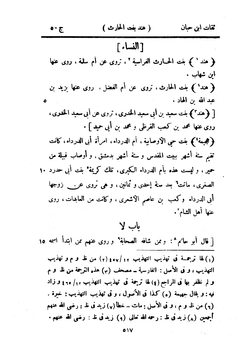 6020 - هجيمة بنت حييّ الأوصابية أم الدَّرْدَاء امْرَأَة أبي الدَّرْدَاء كَانَت تقيم سِتَّة أشهر بِبَيْت الْمُقَدّس وَسِتَّة أشهر بِدِمَشْق وأوصاب قَبيلَة من حمير وَلَيْسَت هَذِه بِأم الدَّرْدَاء الْكُبْرَى تِلْكَ كَرِيمَة بنت أبي حَدْرَد الصُّغْرَى مَاتَت بعد سنة إِحْدَى وَثَمَانِينَ وَهِي تروي عَن زَوجهَا أبي الدَّرْدَاء وَكَعب بن عَاصِم الْأَشْعَرِيّ وَكَانَت من العابدات روى عَنْهَا أهل الشَّام