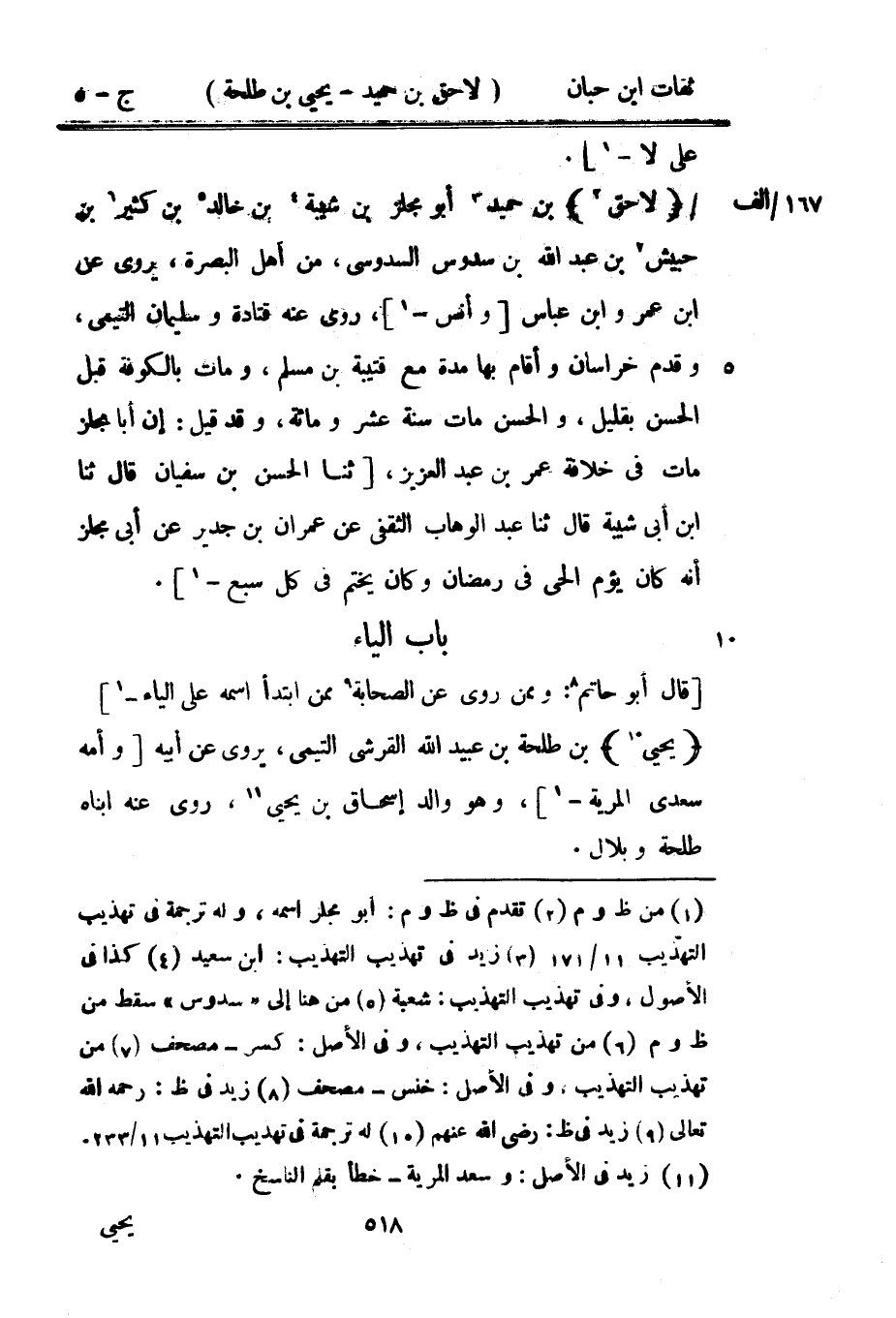 6022 - يحيى بن طَلْحَة بن عبيد الله الْقرشِي التَّيْمِيّ يروي عَن أَبِيه وَأمه سعدى المرية وَهُوَ وَالِد إِسْحَاق بن يحيى روى عَنهُ ابناه طَلْحَة وبلال
