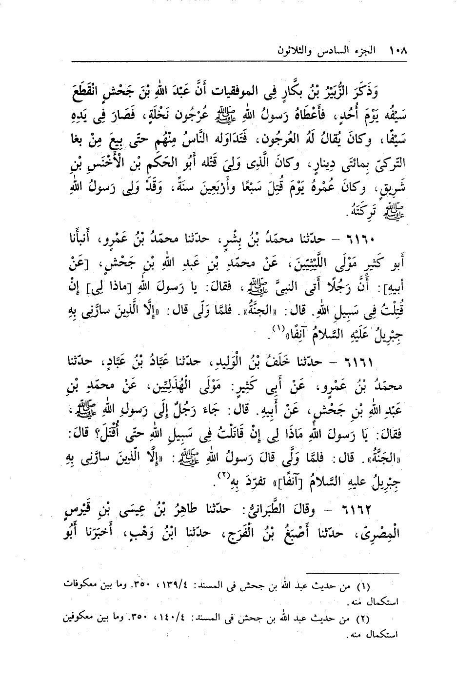6160 - حدثنا محمد بن بشر، حدثنا محمد بن عمرو، أنبأنا أبو كثير مولى الليثيين، عن محمد بن عبد الله بن جحش، [عن أبيه] : أن رَجُلاً أتى النبى - صلى الله عليه وسلم -، فقال: يا رسول الله [ماذا لى] إن قتلت فى سبيل الله. قال: «الجنَّهُ» . فلما ولى قال: «إِلاَّ الَّذيِنَ سارَّنِى بِهِ جِبْرِيلُ عَلَيْهِ السَّلامُ آنِفًا» (¬1) .