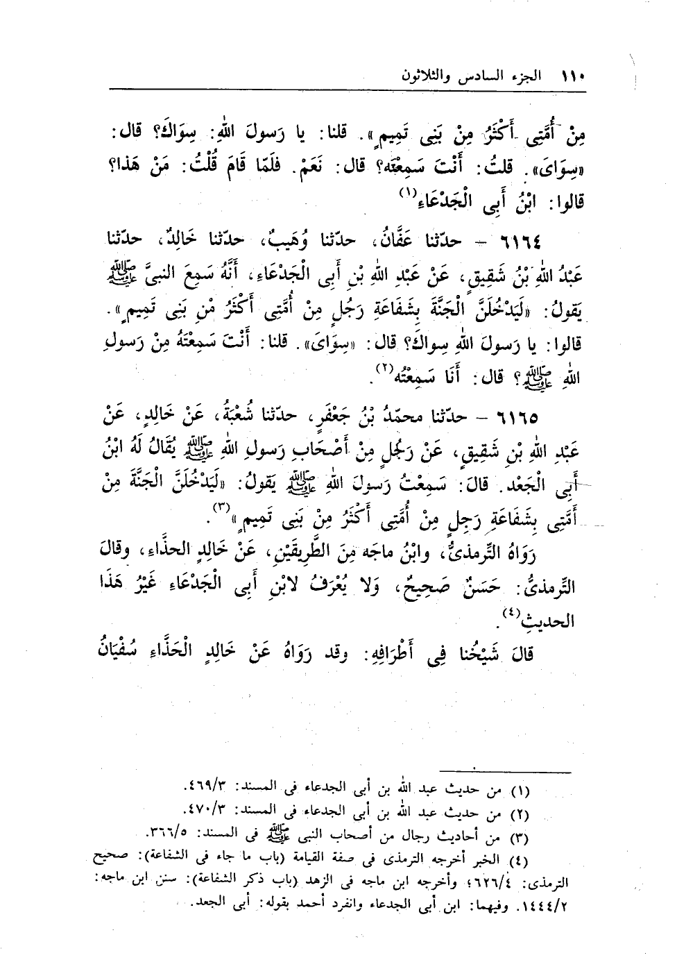 (¬4) الخبر أخرجه الترمذى فى صفة القيامة (باب ما جاء فى الشفاعة) : صحيح الترمذى: 4/626؛ وأخرجه ابن ماجه فى الزهد (باب ذكر الشفاعة) : سنن ابن ماجه: 2/1444. وفيهما: ابن أبى الجدعاء وانفرد أحمد بقوله: أبى الجعد.