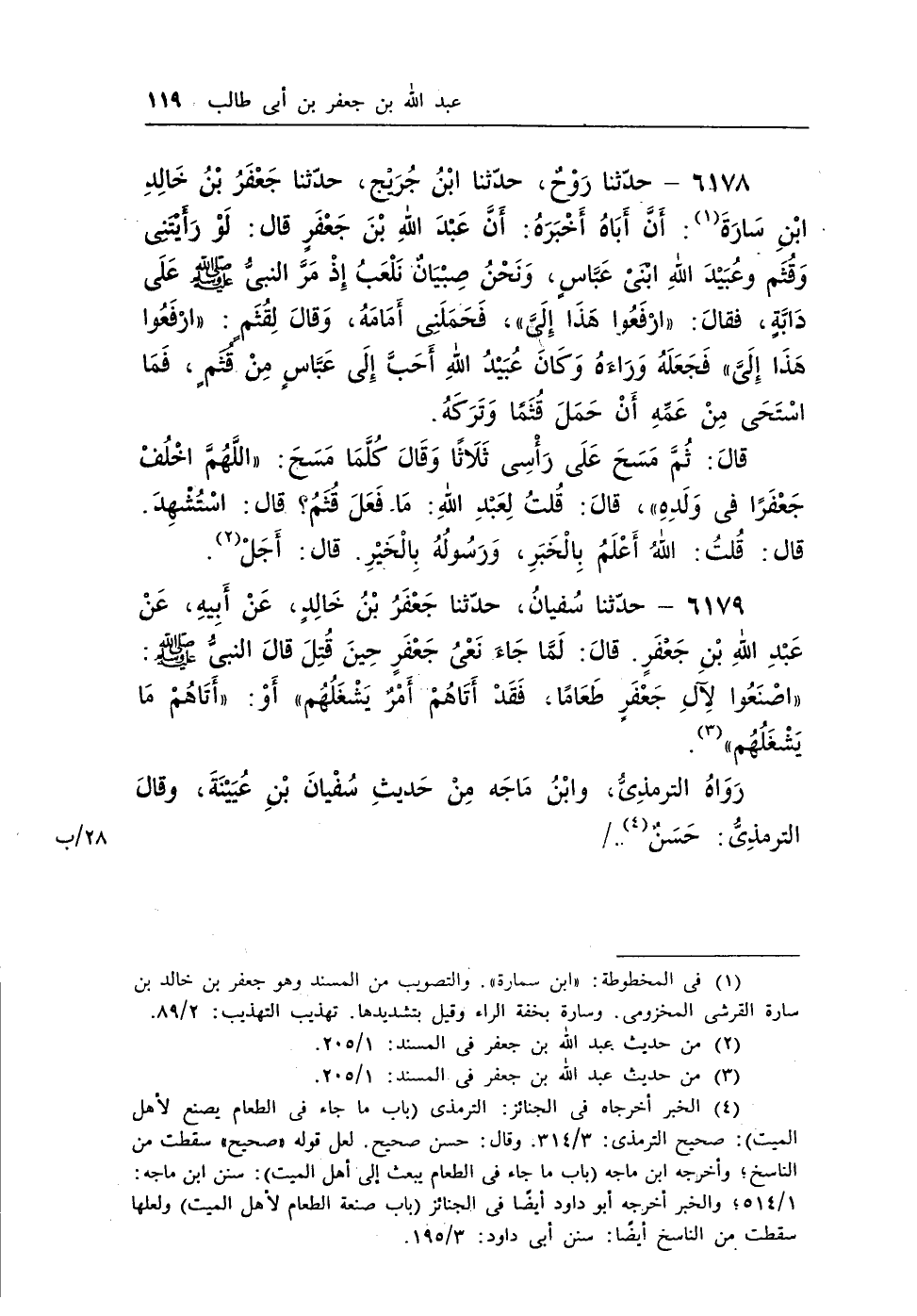 6179 - حدثنا سفيان، حدثنا جعفر بن خالد، عن أبيه، عن عبد الله بن جعفر. قال: لما جاء نعى جعفر حين قتل قال النبى - صلى الله عليه وسلم -: «اصْنَعُوا لآلِ جَعْفَرٍ طَعَامًا، فَقَدْ أَتَاهُمْ أَمْرٌ يَشْغَلُهُم» أو: «أَتَاهُمْ مَا يَشْغَلُهُم» (¬3) .