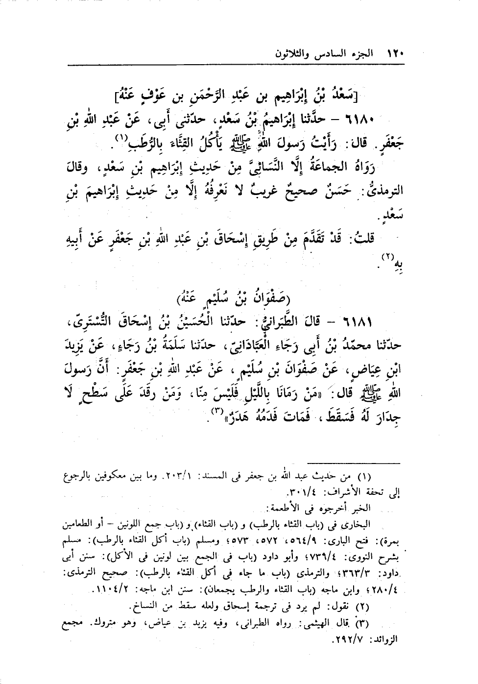 6180 - حدثنا إبراهيم بن سعد، حدثنى أبى، عن عبد الله بن جعفر. قال: رأيت رسول الله - صلى الله عليه وسلم - يأكل القثاء بالرطب (¬1) .