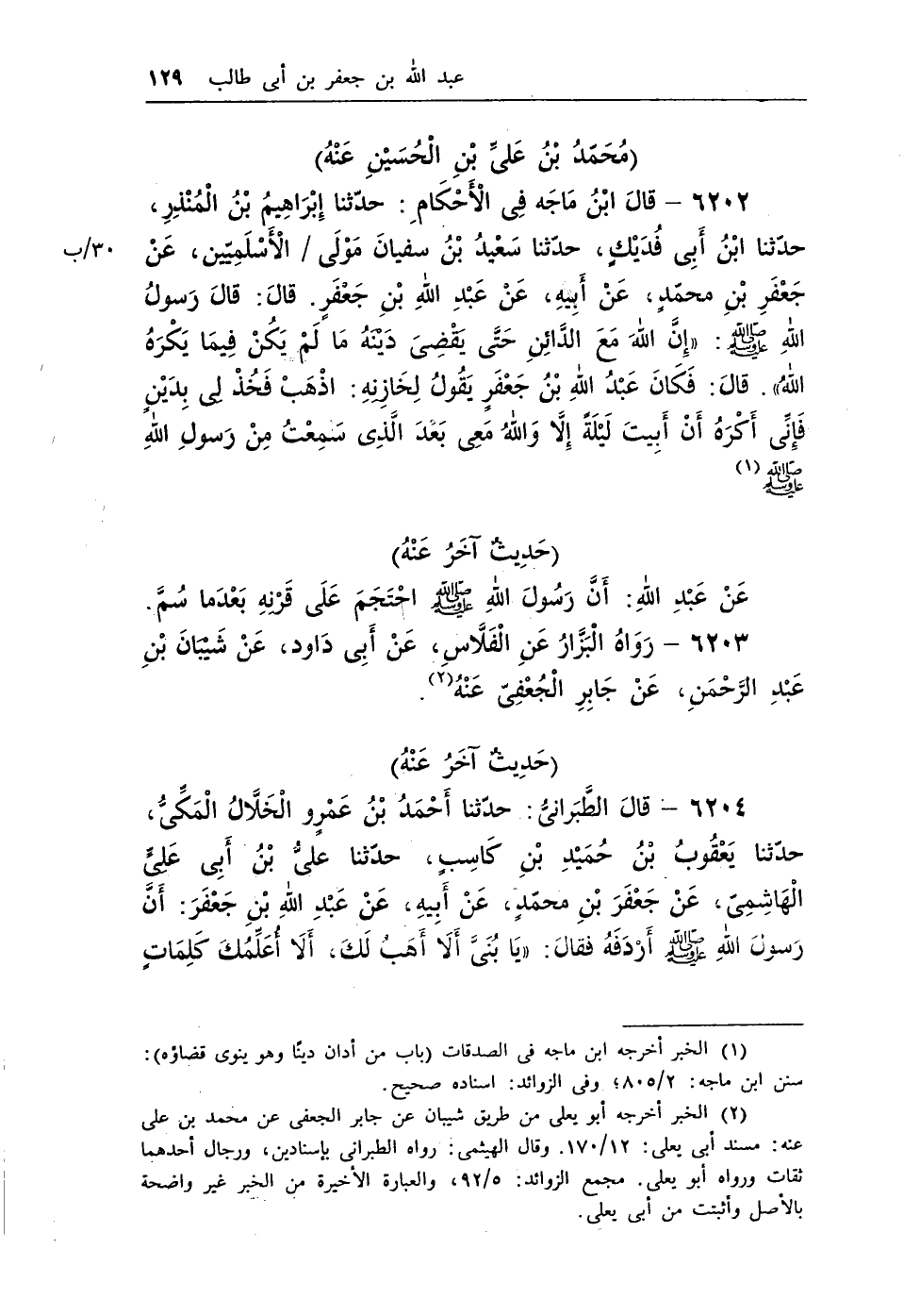 6204 - قال الطبرانى: حدثنا أحمد بن عمرو الخلال المكى، حدثنا يعقوب ابن حميد بن كاسب، حدثنا على بن أبى على الهاشمى، عن جعفر بن محمد، عن أبيه، عن عبد الله بن جعفر: أن رسول الله - صلى الله عليه وسلم - أردفه فقال: «يَا بُنَىَّ أَلاَ أَهَبُ لَكَ، أَلاَ أُعَلِّمُكَ كَلِمَاتٍ