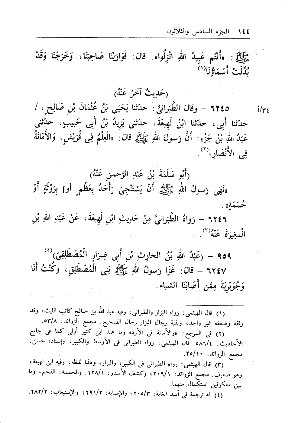 6245 - وقال الطبرانى: حدثنا يحيى بن عثمان بن صالح، / حدثنا أبى، حدثنا ابن لهيعة، حدثنى يزيد بن أبى حبيب، حدثنى عبد الله بن جزء: أن رسول الله - صلى الله عليه وسلم - قال: «الْعِلْمُ فِى قُرَيْشٍ، وَالأَمَانَةُ فِى الأَنْصَارِ» (¬1) .