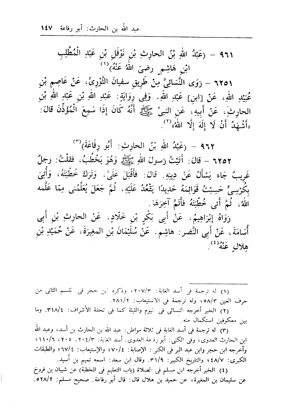 (¬3) له ترجمة فى أسد الغابة فى ثلاثة مواطن: عبد الله بن الحارث بن أسد، وعبد الله ابن الحارث العدوى، وفى الكنى: أبو رفاعة العدوى. أسد الغابة: 3/204، 205، 6/110؛ وأخرجه ابن حجر وابن عبد البر فى الكنى: الإصابة: 4/70؛ والإستيعاب: 4/67؛ والطبقات الكبرى: 7/48؛ والتاريخ الكبير: 9/31. وقال ابن سعد: اسمه تميم بن أسيد.