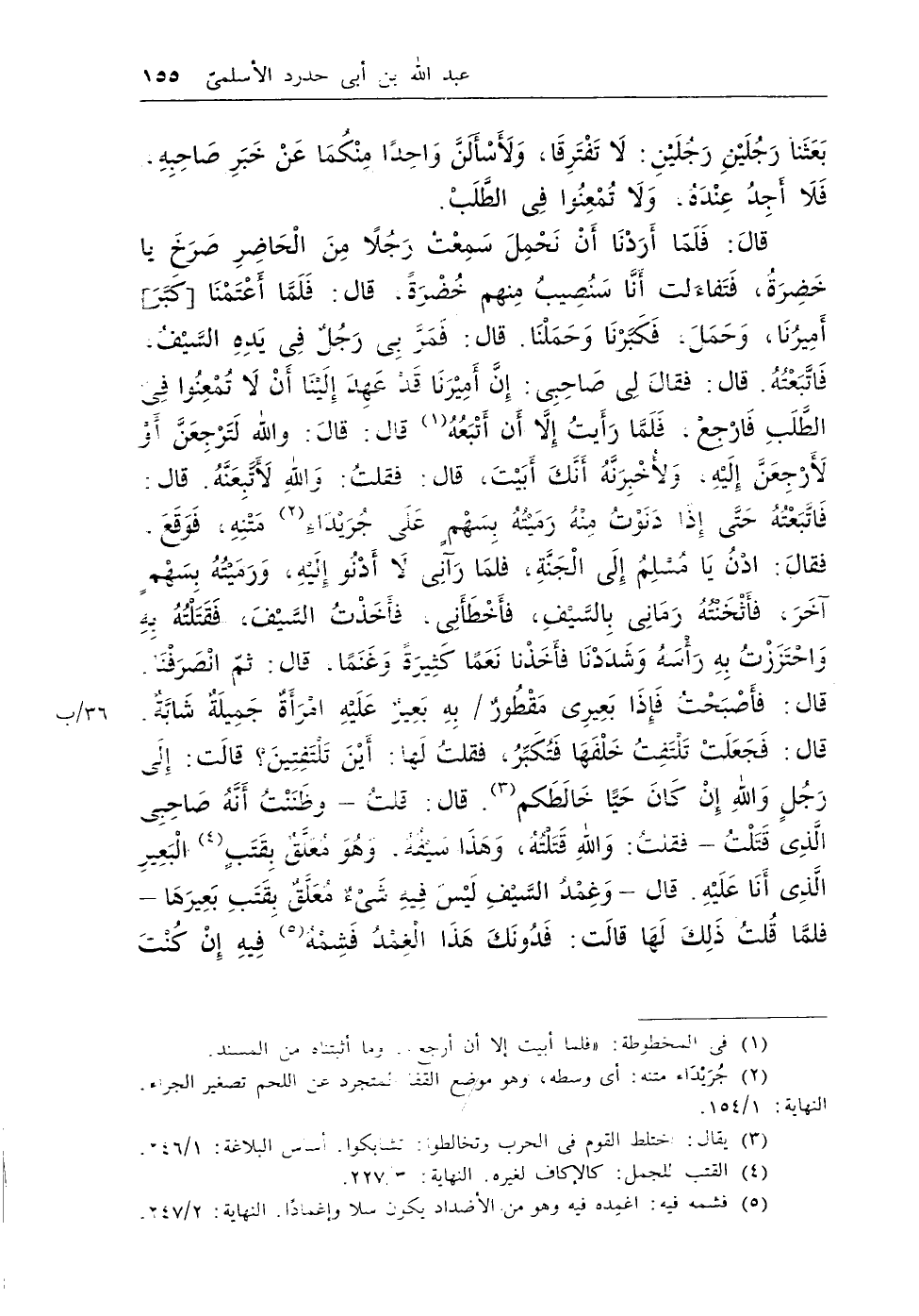 قال: فلما أردنا أن نحمل سمعت رَجُلاً من الحاضر صرخ يا خضرة، فتفاءلت أنا سنصيب منهم خضرة. قال: فلما أعتمنا [كبر] أميرنا، وحمل، فكبرنا وحملنا. قال: فمر بى رجل فى يده السيف، فاتبعته. قال: فقال لى صاحبى: إن أميرنا قد عهد إلينا أن لا تمعنوا فى الطلب فارجع، فلما رأيت إلا أن أتبعه (¬1) قال: قال: والله لترجعن أو لأرجعن إليه، ولأخبرنه أنك أبيت، قال: فقلت: والله لأتبعنه. قال: فاتبعته حتى إذا دنوت منه رميته بسهم على جريداء (¬2) متنه، فوقع، فقال: ادن يا مسلم إلى الجنة، فلما رآنى لا أدنو إليه، ورميته بسهم آخر، فأثخنته رمانى بالسيف، فأخطأنى، فأخذت السيف، فقتلته به واحتززت به رأسه وشددنا فأخذنا نعمًا كثيرةً وغنمًا. قال: ثم انصرفنا. قال: فأصبحت فإذا بعيرى مقطور/ به بعير عليه امرأة جميلة شابة. قال: فجعلت تلتفت خلفها فتكبر، فقلت لها: أين تلتفتين؟ قالت: إلى رَجُلٍ والله إن كان حيًا خالطكم (¬3) . قال: قلت ـ وظننت أنه صاحبى الذى قتلت ـ فقلت: والله قتلته، وهذا سيفه. وهو معلق بقتب (¬4) البعير الذى أنا عليه. قال وغمد السيف ليس فيه شىء معلق بقتب بعيرها ـ فلما قلت ذلك لها قالت: فدونك هذا الغمد فشمه (¬5) فيه إن كنت