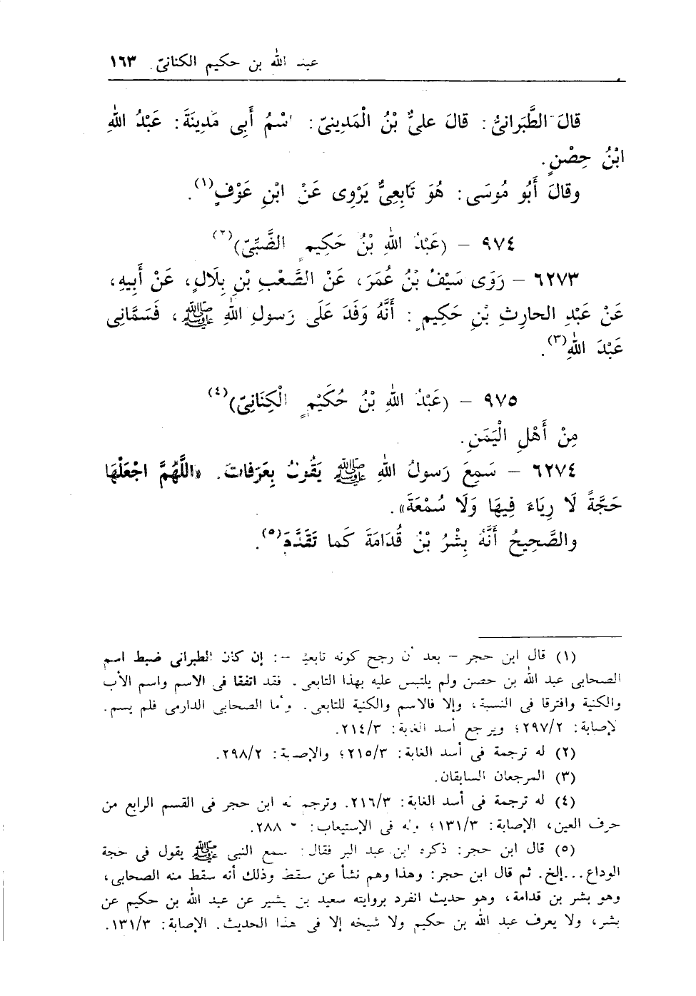 (¬4) قال ابن حجر: ذكره ابن عبد البر فقال: سمع النبى - صلى الله عليه وسلم - يقول فى حجة الوداع ... إلخ. ثم قال ابن حجر: وهذا وهم نشأ عن سقط وذلك أنه سقط منه الصحابى، وهو بشر بن قدامة، وهو حديث انفرد بروايته سعيد بن بشير عن عبد الله بن حكيم عن بشر، ولا يعرف عبد الله بن حكيم ولا شيخه إلا فى هذا الحديث. الإصابة: 3/131.