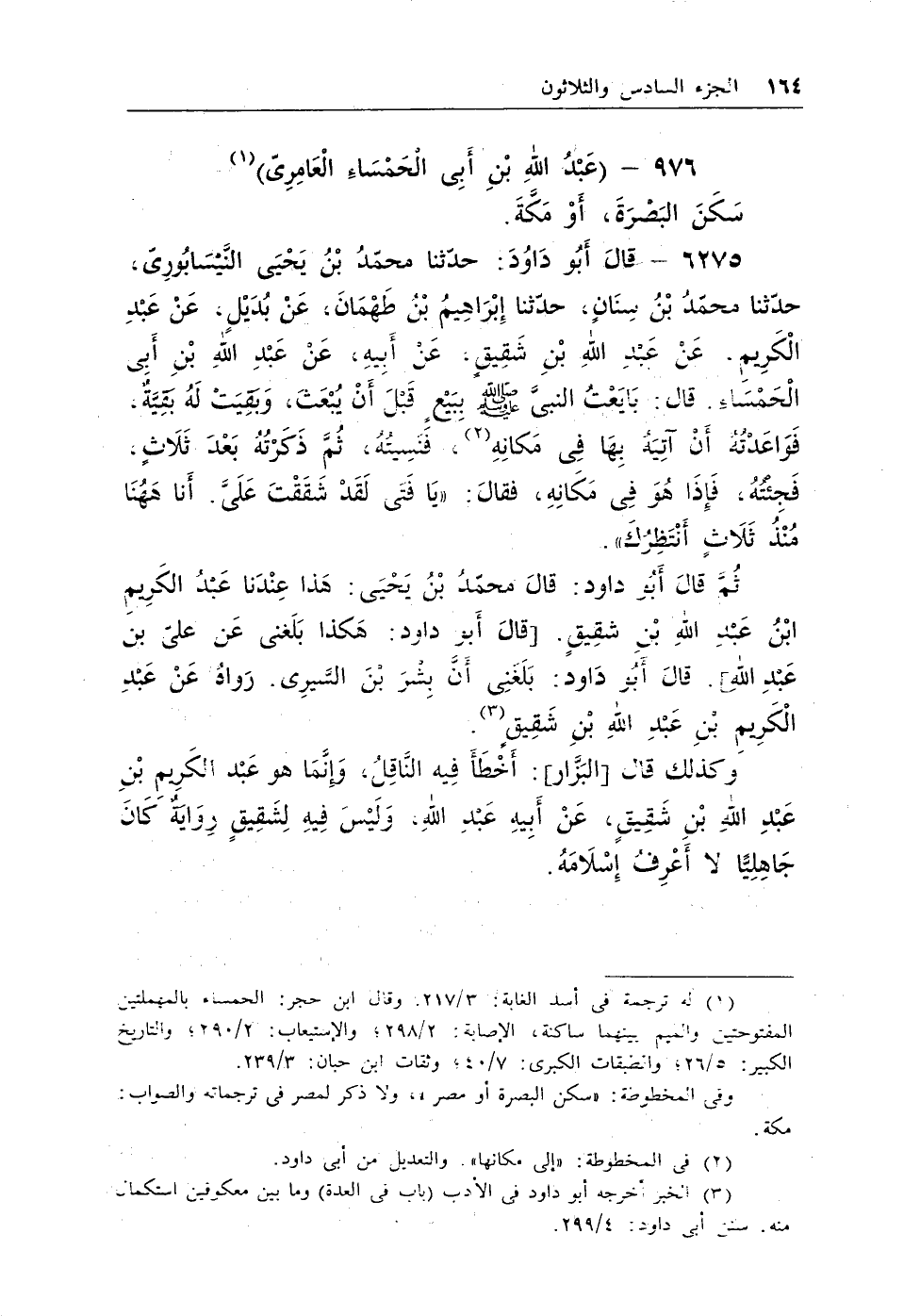 (¬1) له ترجمة فى أسد الغابة: 3/217. وقال ابن حجر: الحمساء بالمهملتين المفتوحتين والميم بينهما ساكنة، الإصابة: 2/298؛ والإستيعاب: 2/290؛ والتاريخ الكبير: 5/26؛ والطبقات الكبرى: 7/40؛ وثقات ابن حبان: 3/239. وفى المخطوطة: «سكن البصرة أو مصر» ، ولا ذكر لمصر فى ترجماته والصواب: مكة.