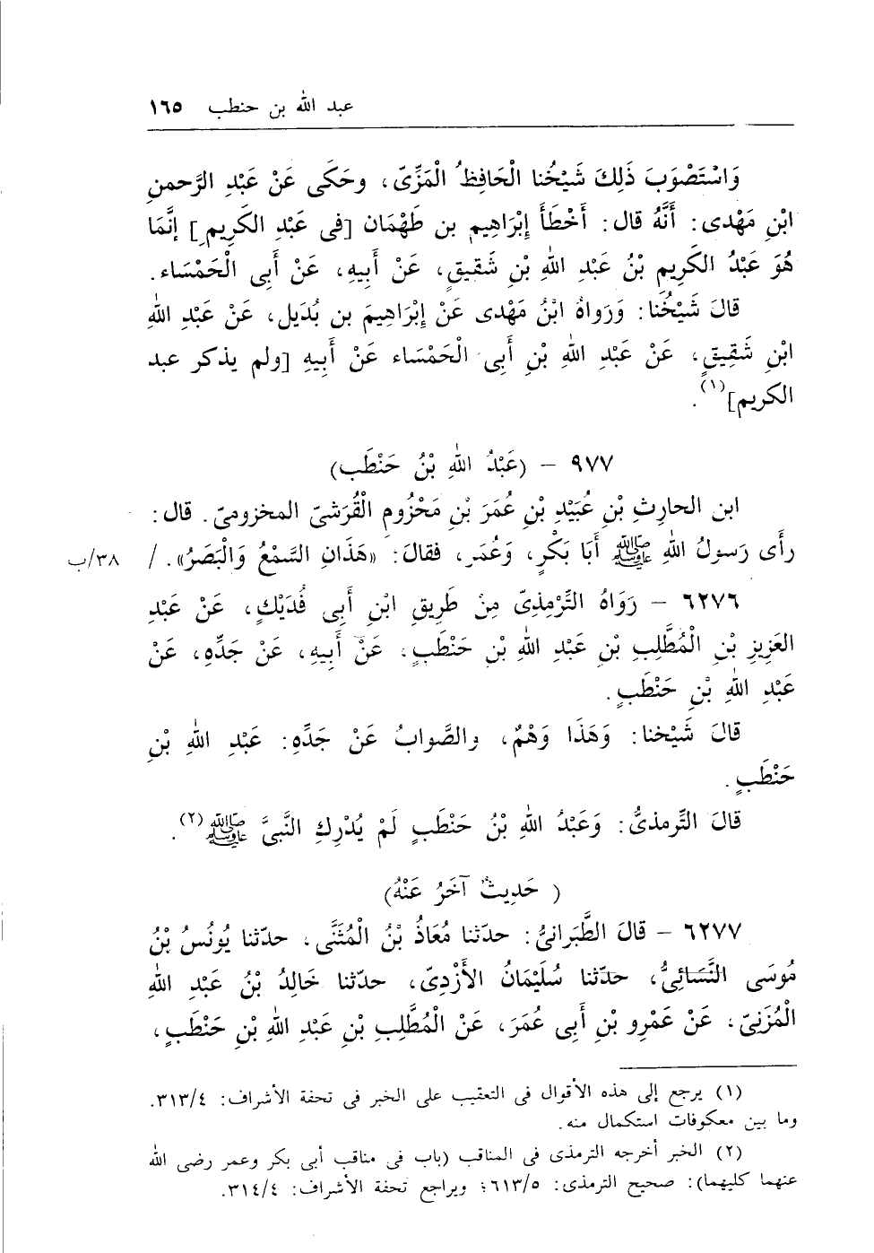 واستصوب ذلك شيخنا الحافظ المزى، وحكى عن عبد الرحمن ابن مهدى: أنه قال: أخطأ إبراهيم بن طهمان [فى عبد الكريم] إنما هو عبد الكريم بن عبد الله بن شقيق، عن أبيه، عن أبى الحمساء.