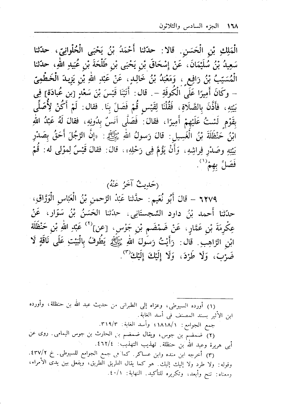 6279 - قال أبو نعيم: حدثنا عبد الرحمن بن العباس الوراق، حدثنا أحمد بن داود السجستانى، حدثنا الحسن بن سوار، عن عكرمة بن عمار، عن ضمضم بن جوس، [عن] (¬1) عبد الله بن حنظلة ابن الراهب. قال: رأيت رسول الله - صلى الله عليه وسلم - يطوف بالبيت على ناقة لا ضرب، ولا طرد، ولا إليك إليك (¬2) .