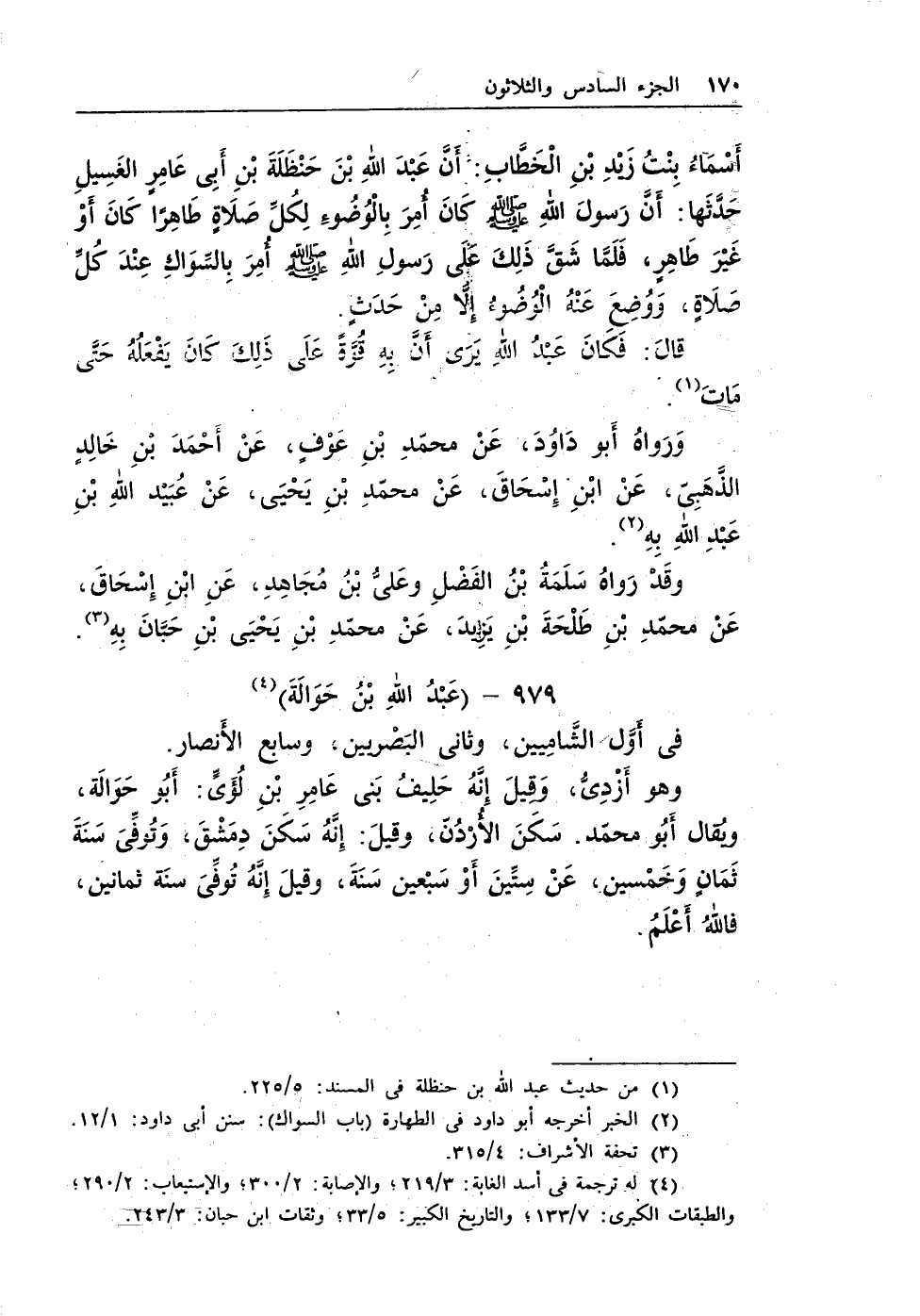 أسماء بنت زيد بن الخطاب: أن عبد الله بن حنظلة بن أبى عامر الغسيل حدثها: أن رسول الله - صلى الله عليه وسلم - كان أمر بالوضوء لكل صلاة طاهرًا كان أو غير طاهر، فلما شق ذلك على رسول الله - صلى الله عليه وسلم - أمر بالسواك عند كل صلاة، ووضع عنه الوضوء إلا من حدث.