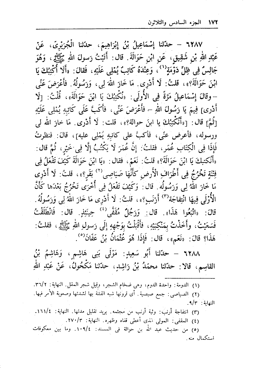6287 - حدثنا إسماعيل بن إبراهيم، حدثنا الجريرى، عن عبد الله بن شقيق، عن ابن حوالة. قال: أتيت رسول الله - صلى الله عليه وسلم -، وهو جالس فى ظل دومة (¬1) ، وعنده كاتب يملى عليه، فقال: «أَلاَ أُكْتِبُكَ يَا ابْنَ حَوَالَةَ؟» ، قل: لا أدرى. ما خار الله لى، ورسوله. فأعرض عنى ـ وقال إسماعيل مرة فى الأولى: «نكتبك يا ابن حوالة» ، قلت [لا أدرى] فيم يا رسول الله ـ. فأعرض عنى، فأكب على كاتبه يملى عليه [ثم] قال: [ «أنكتبك يا ابن حوالة؟» ، قلت: لا أدرى. ما خار الله لى ورسوله، فأعرض عنى، فأكب على كاتبه يملى عليه] ، قال: فنظرت فإذا فى الكتاب عمر، فقلت: إن عمر لا يكتب إلا فى خير، ثم قال: «أنكتبك يا ابن حوالة؟» قلت: نعم، فقال: «يَا ابْنَ حَوَالَةَ كَيْفَ تَفْعَلُ فِى فِتْنَةٍ تَخْرُجُ فِى أَطْرَافِ الأَرضٍِ كأَنَّهَا صَيَاصِى (¬2) بَقَرٍ؟» ، قلت لا أدرى ما خار الله لى ورسوله. قال: وكيف تفعل فى أخرى تخرج بعدها كان الأولى فيها انتفاجة (¬3) أرنب؟» ، قلت: لا أدرى ما خار الله لى ورسوله. قال: «اتْبَعُوا هَذَا» . قال: وَرَجُلٌ مقفى (¬4) حينئذ. قال: فانطلقت فسعيت، وأخذت بمنكبيه، فأقبلت بوجهه إلى رسول الله - صلى الله عليه وسلم -، فقلت: هذا؟ قال: «نعم» ، قال: فإذا هو عثمان ابن عفان (¬5) .
