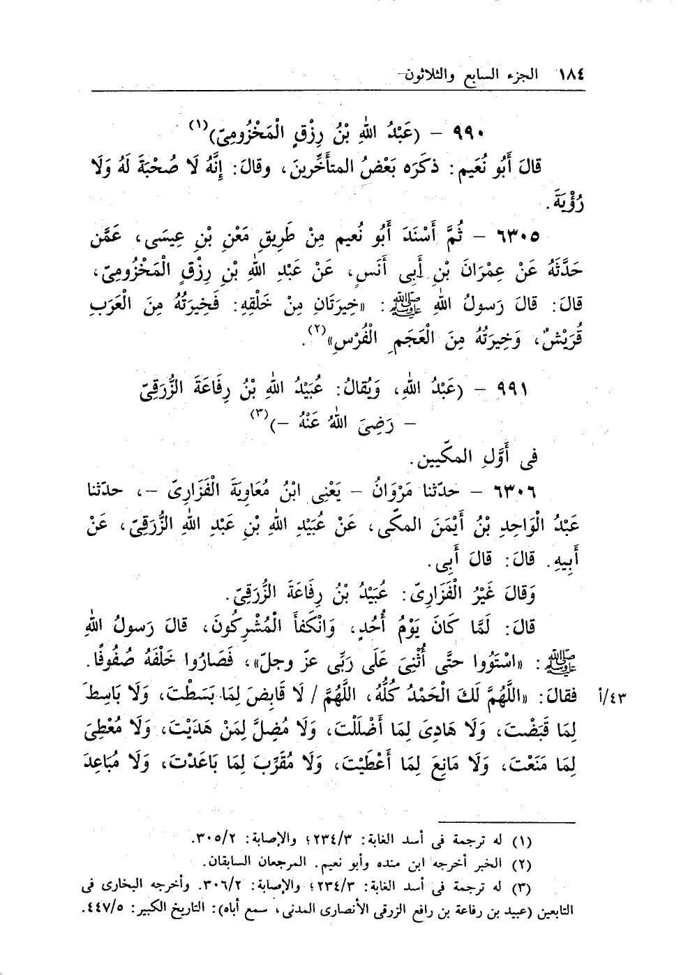 (¬3) له ترجمة فى أسد الغابة: 3/234؛ والإصابة: 2/306. وأخرجه البخارى فى التابعين (عبيد بن رفاعة بن رافع الزرقى الأنصارى المدنى، سمع أباه) : التاريخ الكبير: 5/447.
