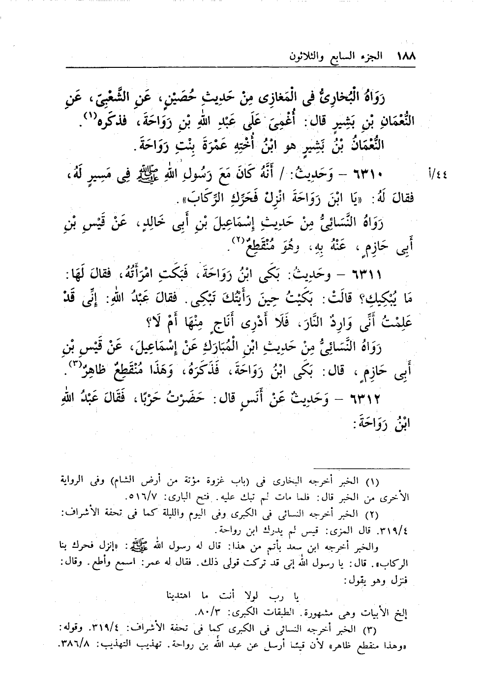 (¬2) الخبر أخرجه النسائى فى الكبرى كما فى تحفة الأشراف: 4/319. وقوله: «وهذا منقطع ظاهر» لأن قيسًا أرسل عن عبد الله بن رواحة. تهذيب التهذيب: 8/386.