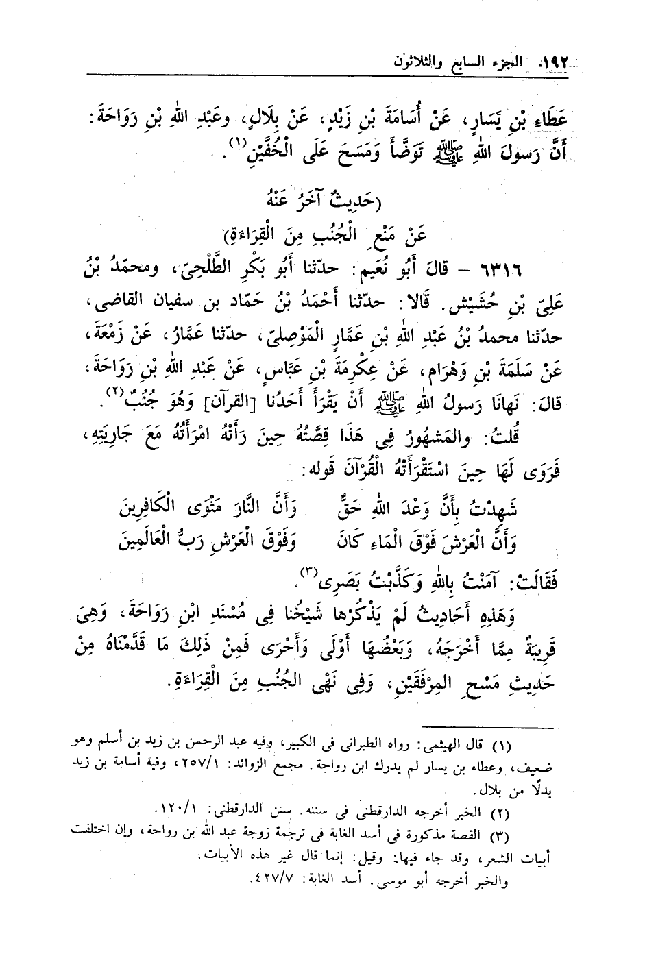 وهذه أحاديث لم يذكرها شيخنا فى مسند ابن رواحة، وهى قريبة مما أخرجه، وبعضها أولى وأحرى فمن ذلك ما قدمناه من حديث مسح المرفقين، وفى نهى الجنب من القراءة.