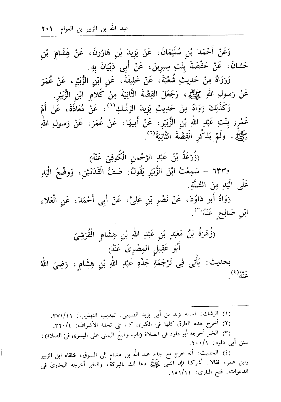 وكذلك رواه من حديث يزيد الرشك (¬1) ، عن معاذة، عن أم عمرو بنت عبد الله بن الزبير، عن أبيها، عن عمر، عن رسول الله - صلى الله عليه وسلم -، ولم يذكر القصة الثانية (¬2) .