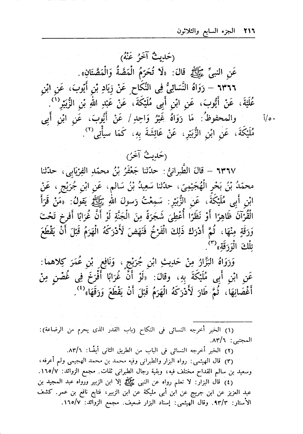 (¬4) قال البزار: لا نعلم رواه عن النبى - صلى الله عليه وسلم - إلا ابن الزبير ورواه عبد المجيد بن عبد العزيز عن ابن جريج عن ابن أبى مليكة عن ابن الزبير، فتابع نافع بن عمر. كشف الأستار: 3/93. وقال الهيثمى: إسناد البزار ضعيف. مجمع الزوائد: 7/165.