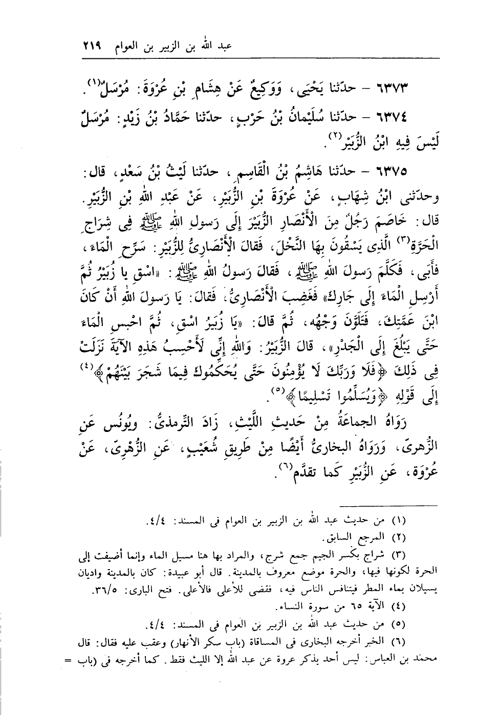 (¬6) الخبر أخرجه البخارى فى المساقاة (باب سكر الأنهار) وعقب عليه فقال: قال محمد بن العباس: ليس أحد يذكر عروة عن عبد الله إلا الليث فقط. كما أخرجه فى (باب شرب الأعلى قبل الأسفل) ، وأخرجه فى الصلح (باب إذا أشار الإمام بالصلح، فأبى حكم عليه بالحكم المبين) وفى التفسير (الآية) : فتح البارى: 5/34، 38، 309، 8/254؛ وأخرجه مسلم فى الفضائل (باب وجوب اتباعه - صلى الله عليه وسلم - (: مسلم بشرح النووى: 5/204؛ وأخرجه أبو داود فى الأقضية (أبواب من القضاء) : سنن أبى داود: 3/315؛ والترمذى فى الأحكام (باب ما جاء فى الرجلين يكون أحدهما أسفل من الأخر فى الماء) ، وفى التفسير (باب ومن سورة النساء) : صحيح الترمذى: 3/635، 5/238؛ والنسائى فى آداب القضاة (باب الرخصة للحاكم الأمين أن يحكم وهو غضبان) : المجتبى: 8/209؛ وأخرجه ابن ماجه فى المقدمة (باب تعظيم حديث رسول الله - صلى الله عليه وسلم - والتغليظ على من عارضه) : كما أخرجه فى الرهون (باب الشرب من الأودية ومقدار حبس الماء) : سنن ابن ماجه: 1/6، 2/829.