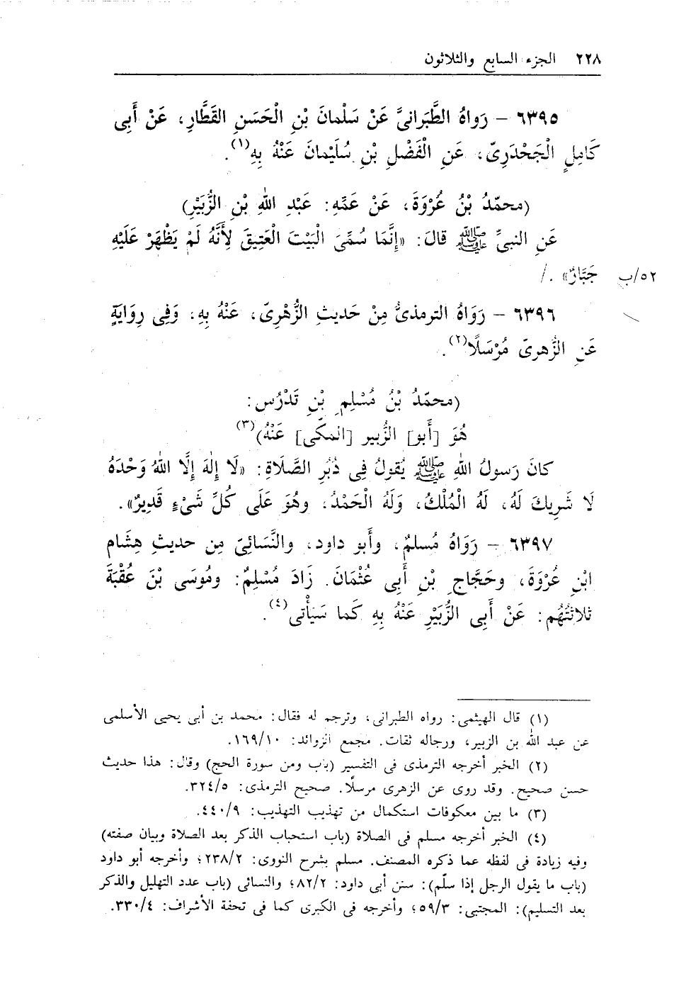 (¬4) الخبر أخرجه مسلم فى الصلاة (باب استحباب الذكر بعد الصلاة وبيان صفته) وفيه زيادة فى لفظه عما ذكره المصنف. مسلم بشرح النووى: 2/238؛ وأخرجه أبو داود (باب ما يقول الرجل إذا سلم) : سنن أبى داود: 2/82؛ والنسائى (باب عدد التهليل والذكر بعد التسليم) : المجتبى: 3/59؛ وأخرجه فى الكبرى كما فى تحفة الأشراف: 4/330.
