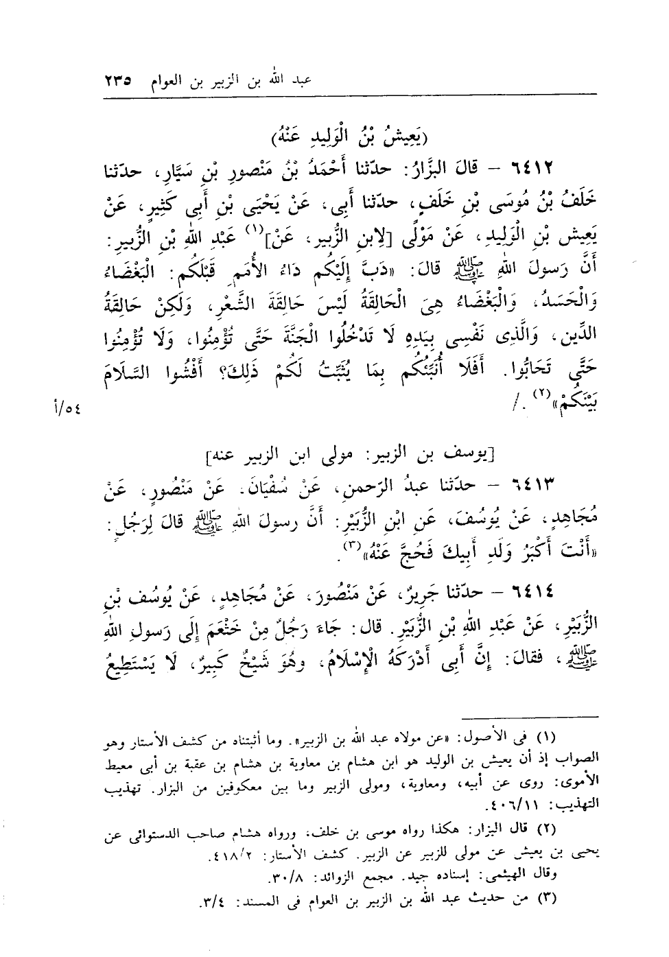 (¬3) من حديث عبد الله بن الزبير بن العوام فى المسند: 4/3.