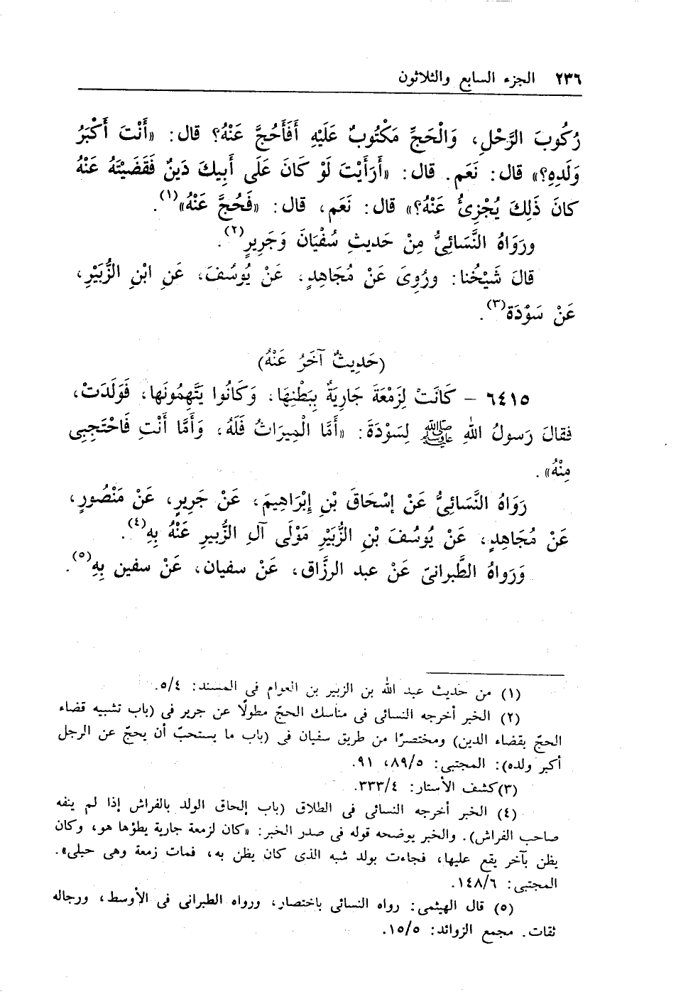 (¬2) الخبر أخرجه النسائى فى مناسك الحج مطولاً عن جرير فى (باب تشبيه قضاء الحج بقضاء الدين) ومختصراً من طريق سفيان فى (باب ما يستحب أن يحج عن الرجل أكبر ولده) : المجتبى: 5/89، 91.