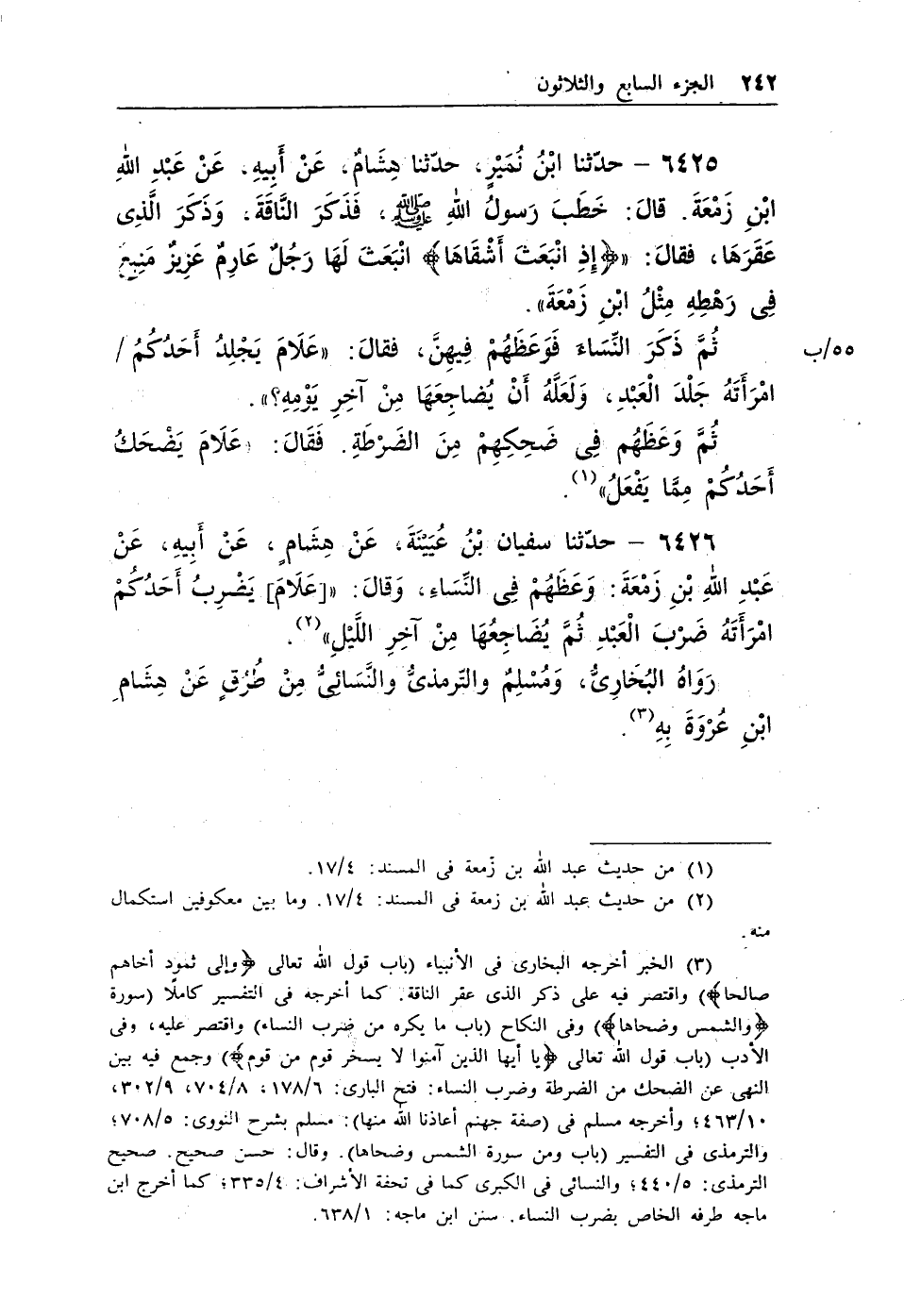 6426 - حدثنا سفيان بن عيينة، عن هشام، عن أبيه، عن عبد الله بن زمعة: وعظهم فى النساء، وقال: « [عَلاَمَ] يَضْرِبُ أَحَدُكُمْ امْرَأَتَهُ ضَرْبَ الْعَبْدِ ثُمَّ يُضَاجِعُهَا مِنْ آخِرِ اللَّيْلِ» (¬2) .
